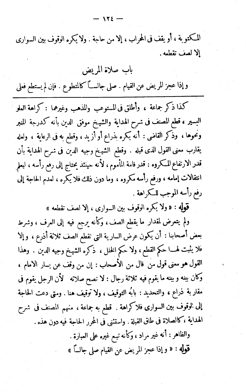 المكتوبة أو يقف في المحراب إلا من حاجة ولا يكره الوقوف بين السواري إلا لصف تقطعه.