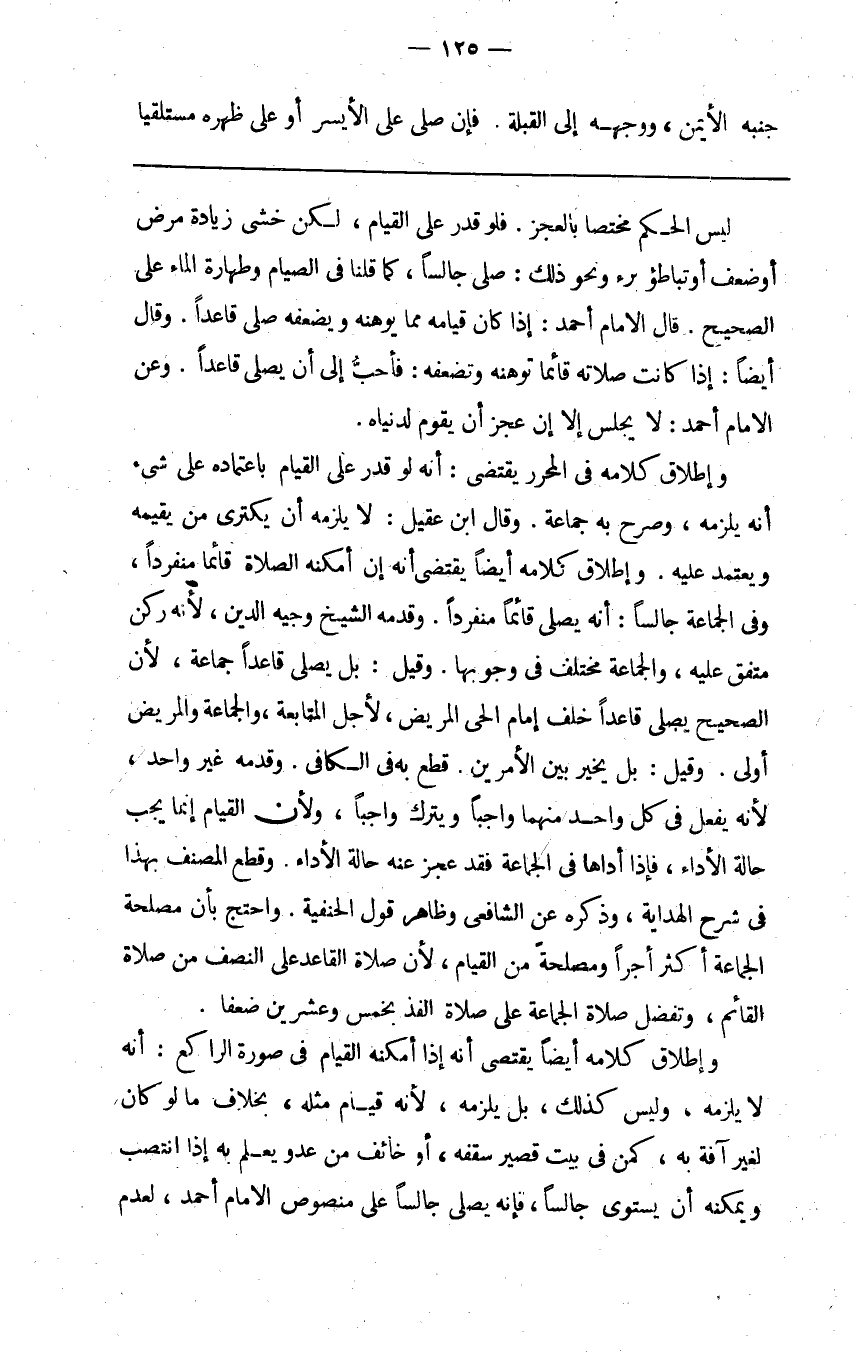 وإطلاق كلامه في المحرر يقتضي أنه لو قدر على القيام باعتماده على شيء أنه يلزمه وصرح به جماعة وقال ابن عقيل لا يلزمه أن يكتري من يقيمه ويعتمد عليه وإطلاق كلامه أيضا يقتضي أنه إن أمكنه الصلاة قائما منفردا وفي الجماعة جالسا أنه يصلي قائما منفردا وقدمه الشيخ وجيه الدين لأنه ركن متفق عليه والجماعة مختلف في وجوبها وقيل: بل يصلي قاعدا جماعة لأن الصحيح يصلي قاعدا خلف إمام الحي المريض لأجل المتابعة والجماعة والمريض أولى وقيل: بل يخير بين الأمرين قطع به في الكافي وقدمه غير واحد لأنه يفعل في كل واحد منهما واجبا ويترك واجبا ولأن القيام إنما يجب حالة الأداء فإذا أداها في الجماعة فقد عجز عنه حالة الأداء قطع المصنف بهذا في شرح الهداية وذكره عن الشافعي وظاهر قول الحنفية واحتج بأن مصلحة الجماعة أكثر أجرا ومصلحة من القيام لأن صلاة القاعد على النصف من صلاة القائم وتفضل صلاة الجماعة على صلاة الفذ بخمس وعشرين ضعفا.