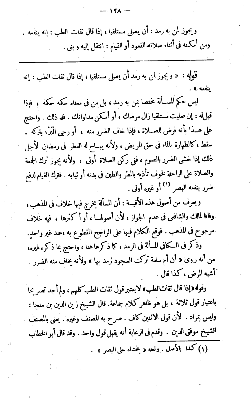 ليس حكم المسألة مختصا بمن به رمد بل من في معناه حكمه حكمه فإذا قيل له إن صليت مستلقيا زال مرضك أو أمكن مداواتك فله ذلك واحتج على هذا بأنه فرض للصلاة فإذا خاف الضرر منه أو رجى البرء بتركه سقط كالطهارة بالماء في حق المريض ولأنه يباح له الفطر في رمضان لأجل ذلك إذا خشى الضرر بالصوم ففي ركن الصلاة أولى ولأنه يجوز ترك الجمعة والصلاة على الراحلة لخوف تأذيه بالمطر والطين في بدنه أو ثيابه فترك القيام لدفع ضرر ينفعه البصر1 أو غيره أولى.