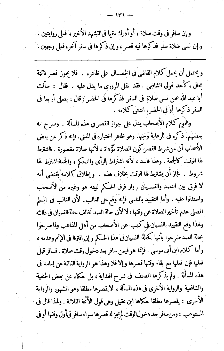 وعموم كلام الأصحاب يدل على جواز القصر في هذه المسألة وصرح به بعضهم ذكره في الرعاية وجها وهو ظاهر اختياره في المغني فإنه ذكر عن بعض الأصحاب أن من شرط القصر كون الصلاة مؤداة لأنها صلاة مقصورة فاشترط لها الوقت كالجمعة وهذا فاسد لأنه اشتراط بالرأي والتحكم والجمعة اشترط لها شروط فجاز أن يشترط لها الوقت بخلاف هذه وإطلاق كلامه يقتضي أنه لا فرق بين التعمد والنسيان ولو فرق الحكم لبينه هو وغيره من الأصحاب واستدلوا عليه وأما التقييد بالناسي فإنه وقع على الغالب لأن الغالب في المسلم المصلي عدم تأخير الصلاة عن وقتها لا لأن حالة العمد تحالف حالة النسيان في ذلك ولهذا وقع التقييد بالنسيان في كتب عن الأصحاب من أهل المذاهب ولما صرحوا بحالة العمد صرحوا بأنها كحالة النسيان في هذا الحكم وإن افترقا في الإثم وعدمه وأما كلام ابن أبي موسى فإنما هو فيمن سافر بعد دخول وقت صلاة فسافر قبل فعلها فإن فعلها مع بقاء وقتها قصرها وإلا فلا وهذا هو الرواية الثالثة عن إمامنا في هذه المسألة ولم يذكرها المصنف في شرح الهداية بل حكى عن بعض الحنفية والشافعية والرواية الأخرى في هذه المسألة لا يقصرها مطلقا وهو المشهور والرواية الأخرى يقصرها مطلقا حكاها ابن عقيل وهي قول الأئمة الثلاثة ولهذا قال في المستوعب ومن سافر بعد دخول الوقت لم يجز له قصرها سواء سافر في أول وقتها أو في