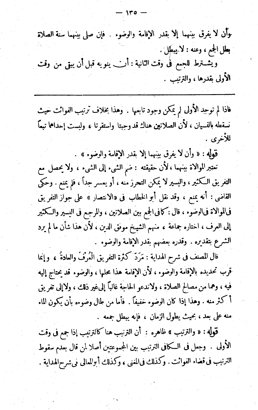 قوله: "والترتيب" ظاهره أن الترتيب هنا كالترتيب إذا جمع في وقت الأولى وجعل في الكافي الترتيب بين المجموعتين أصلا لمن قال بعدم سقوط الترتيب في قضاء الفوائت وكذلك في المغني وكذلك أبو المعالي في شرح الهداية.