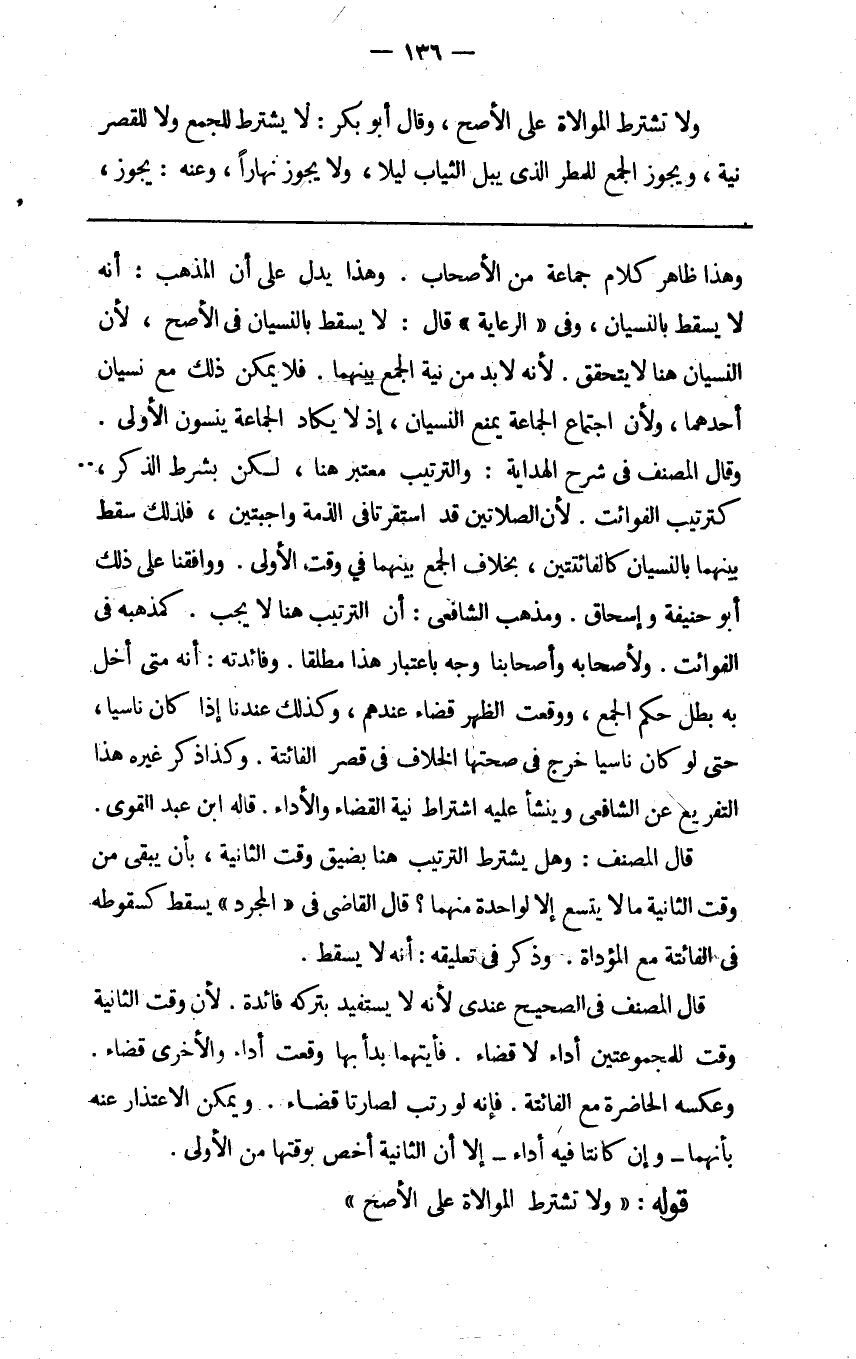 ولا تشترط الموالاة على الأصح وقال أبو بكر لا يشترط للجمع ولا للقصر نية ويجوز الجمع للمطر الذي يبل الثياب ليلا ولا يجوز نهارا وعنه يجوز،