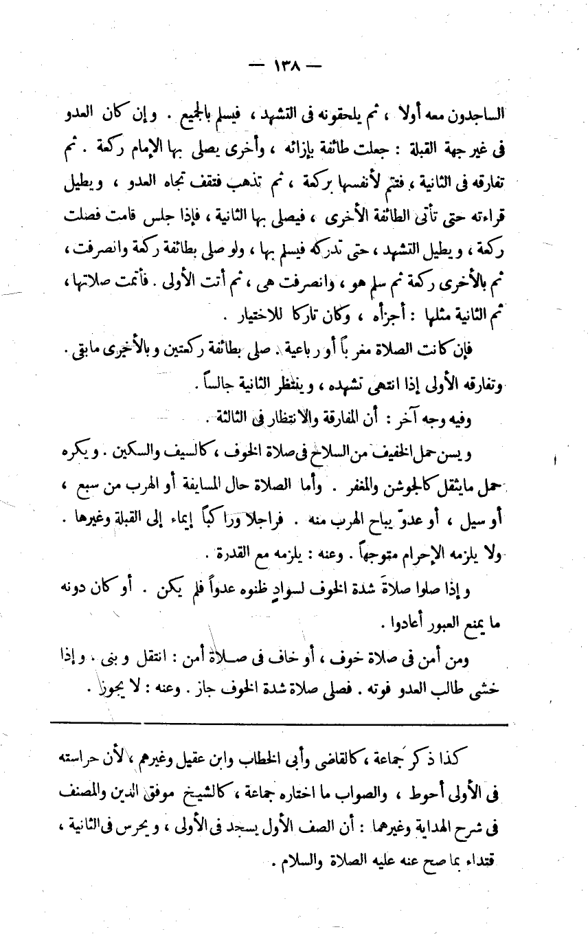 الساجدون معه أولا ثم يلحقونه في التشهد فيسلم بالجميع وإن كان العدو في غير جهة القبلة جعلت طائفة بإزائه وأخرى يصلي بها الإمام ركعة ثم تفارقه في الثانية فتتم لأنفسها بركعة ثم تذهب فتقف تجاه العدو ويطيل قراءته حتى تأتي الطائفة الأخرى فيصلي بها الثانية فإذا جلس قامت فصلت ركعة ويطيل التشهد حتى تدركه فيسلم بها ولو صلى بطائفة ركعة وانصرفت ثم بالأخرى ركعة ثم سلم هو وانصرفت هي ثم أتت الأولى فأتمت صلاتها ثم الثانية مثلها أجزأه وكان تاركا للاختيار.