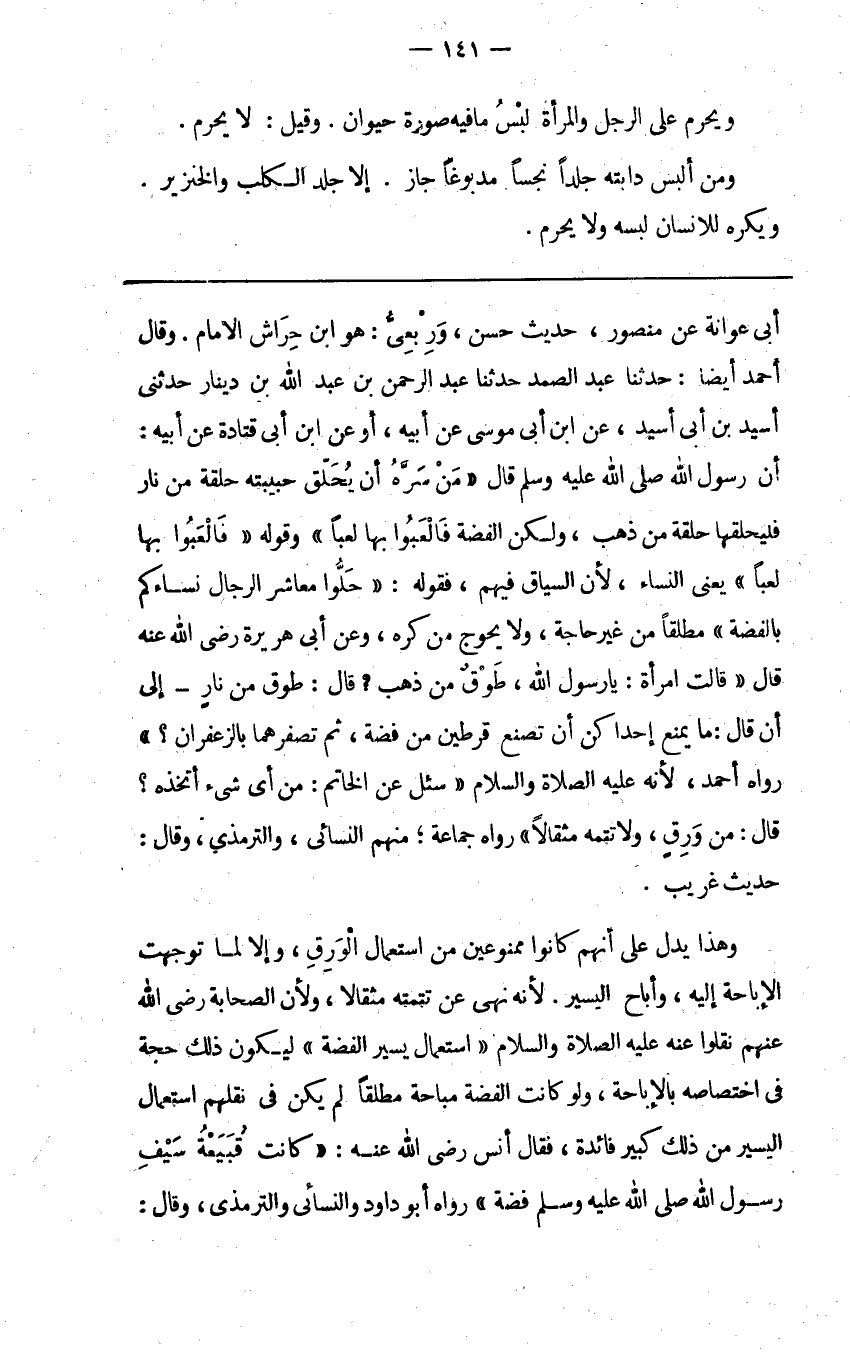 أبي عوانة عن منصور حديث حسن وربعي هو ابن حراش الإمام وقال أحمد أيضا حدثنا عبد الصمد حدثنا عبد الرحمن بن عبد الله بن دينار حدثني أسيد بن أبي أسيد عن ابن أبي موسى عن أبيه أو عن ابن أبي قتادة عن أبيه أن رسول الله صلى الله عليه وسلم قال " من سره أن يحلق حبيبته حلقة من نار فليحلقها حلقة من ذهب ولكن الفضة فالعبوا بها لعبا " وقوله " فالعبوا بها لعبا " يعني النساء لأن السياق فيهم فقوله: " حلوا معاشر الرجال نساءكم بالفضة " مطلقا من غير حاجة ولا يحوج من كره وعن أبي هريرة رضي الله عنه قال قالت امرأة يا رسول الله طوق من ذهب قال طوق من نار إلى أن قال ما يمنع أحداكن أن تصنع قرطين من فضة ثم تصغرهما بالزعفران رواه أحمد لأنه عليه الصلاة والسلام "سئل عن الخاتم: من أي شيء أتخذه؟ قال من ورق ولا تتمه مثقالا " رواه جماعة منهم النسائي والترمذي وقال: حديث غريب.