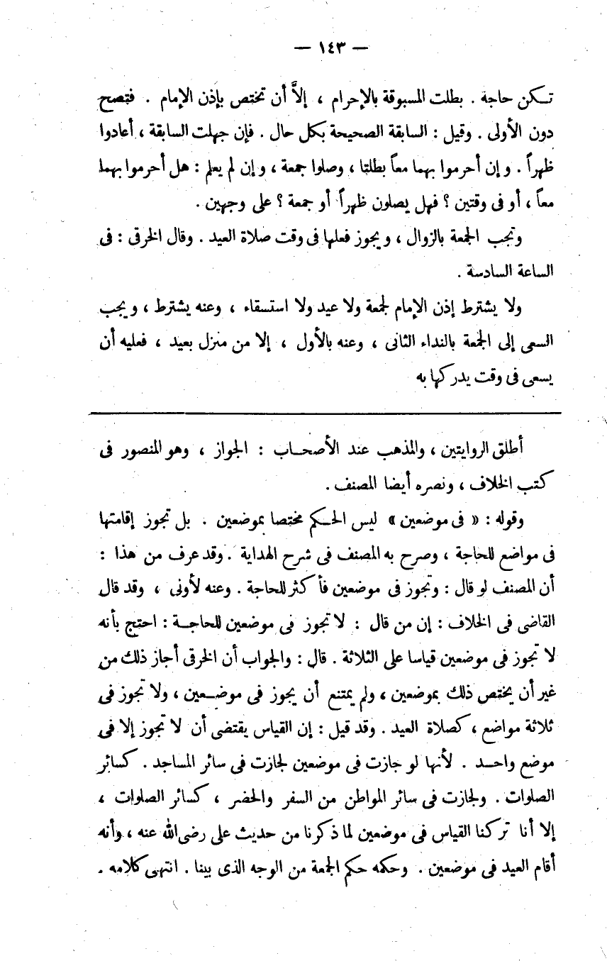 وقوله: "في موضعين" ليس الحكم مختصا بموضعين بل تجوز إقامتها في مواضع للحاجة وصرح به المصنف في شرح الهداية وقد عرف من هذا أن المصنف لو قال وتجوز في موضعين فأكثر للحاجة وعنه لأولى وقد قال القاضي في الخلاف إن من قال لا تجوز في موضعين للحاجة احتج بأنه لا تجوز في موضعين قياسا على الثلاثة قال والجواب أن الخرقي أجاز ذلك من غير أن يختص ذلك بموضعين ولم يمتنع أن يجوز في موضعين ولا تجوز في ثلاثة مواضع كصلاة العيد وقد قيل إن القياس يقتضي أن لا تجوز إلا في موضع واحد لأنها لو جازت في موضعين لجازت في سائر المساجد كسائر الصلوات ولجازت في سائر المواطن من السفر والحضر كسائر الصلوات إلا أنا تركنا القياس في موضعين لما ذكرنا من حديث علي رضي الله عنه وأنه أقام العيد في موضعين وحكمه حكم الجمعة من الوجه الذي بينا انتهى كلامه.