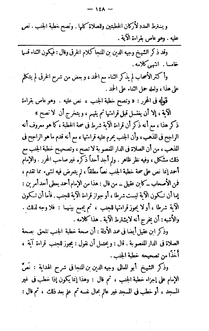 ذكر هذا مع أنه ذكر أن قراءة الآية شرط في صحة الخطبة كما هو معروف أنه الراجح في المذهب وأن الجنب يحرم عليه قراءتها مع أنه قدم ما هو الراجح في المذهب من أن الصلاة في الدار المغصوبة لا تصح وتصحيح خطبة الجنب مع ذلك مشكل وفيه نظر ظاهر ولم أجد أحدا ذكره غير صاحب المحرر والإمام أحمد إنما نص على صحة خطبة الجنب نصا مطلقا لم يتعرض فيه لشيء مما تقدم فمن الأصحاب كابن عقيل من قال هذا من الإمام أحمد يعطى أحد أمرين إما أن تكون الآية ليست شرطا أو جواز قراءة الآية للجنب فأما أن تكون الآية شرطا أو لا يجوز قراءتها للجنب ثم يجمع بينهما فلا وجه لذلك والأشبه أن يخرج أنه لا يشترط الآية هذا كلامه.