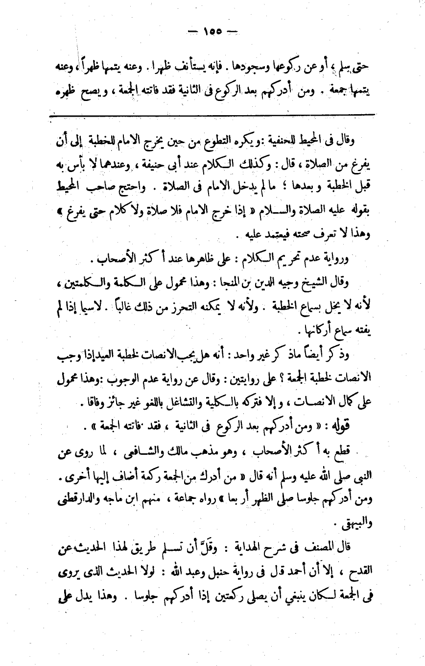 وقال في المحيط للحنفية ويكره التطوع من حين يخرج الإمام للخطبة إلى أن يفرغ من الصلاة قال وكذلك الكلام عند أبي حنيفة وعندهما لا بأس به قبل الخطبة وبعدها مالم يدخل الإمام في الصلاة واحتج صاحب المحيط بقوله عليه الصلاة والسلام " إذا خرج الإمام فلا صلاة ولا كلام حتى يفرغ " وهذا لا تعرف صحته فيعتمد عليه.