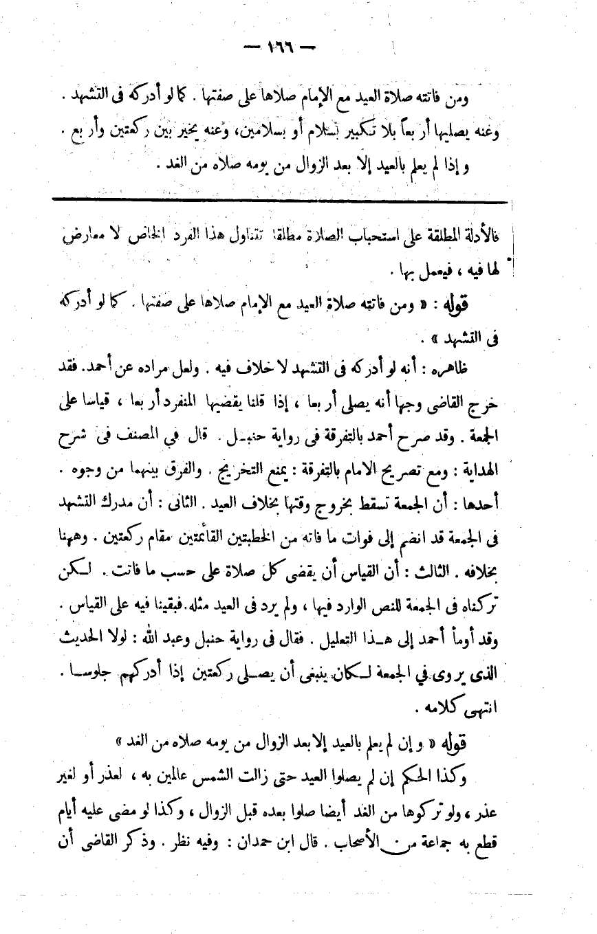 ظاهره أنه لو أدركه في التشهد لا خلاف فيه ولعل مراده عن أحمد فقد خرج القاضي وجها أنه يصلي أربعا إذا قلنا يقضيها المنفرد أربعا قياسا على الجمعة وقد صرح أحمد بالتفرقة في رواية حنبل قال في المصنف في شرح الهداية ومع تصريح الامام بالتفرقة يمنع التخريج والفرق بينهما من وجوه أحدها أن الجمعة تسقط بخروج وقتها بخلاف العيد الثاني أن مدرك التشهد في الجمعة قد انضم إلى فوات ما فاته من الخطبتين القائمتين مقام ركعتين وههنا بخلافه الثالث أن القياس أن يقضى كل صلاة على حسب ما فاتت لكن تركناه في الجمعة للنص الوارد فيها ولم يرد في العيد مثله فبقينا فيه على القياس وقد أومأ أحمد إلى هذا التعليل فقال في رواية حنبل وعبد الله لولا الحديث الذي يروى في الجمعة لكان ينبغي أن يصلى ركعتين إذا أدركهم جلوسا انتهى كلامه.