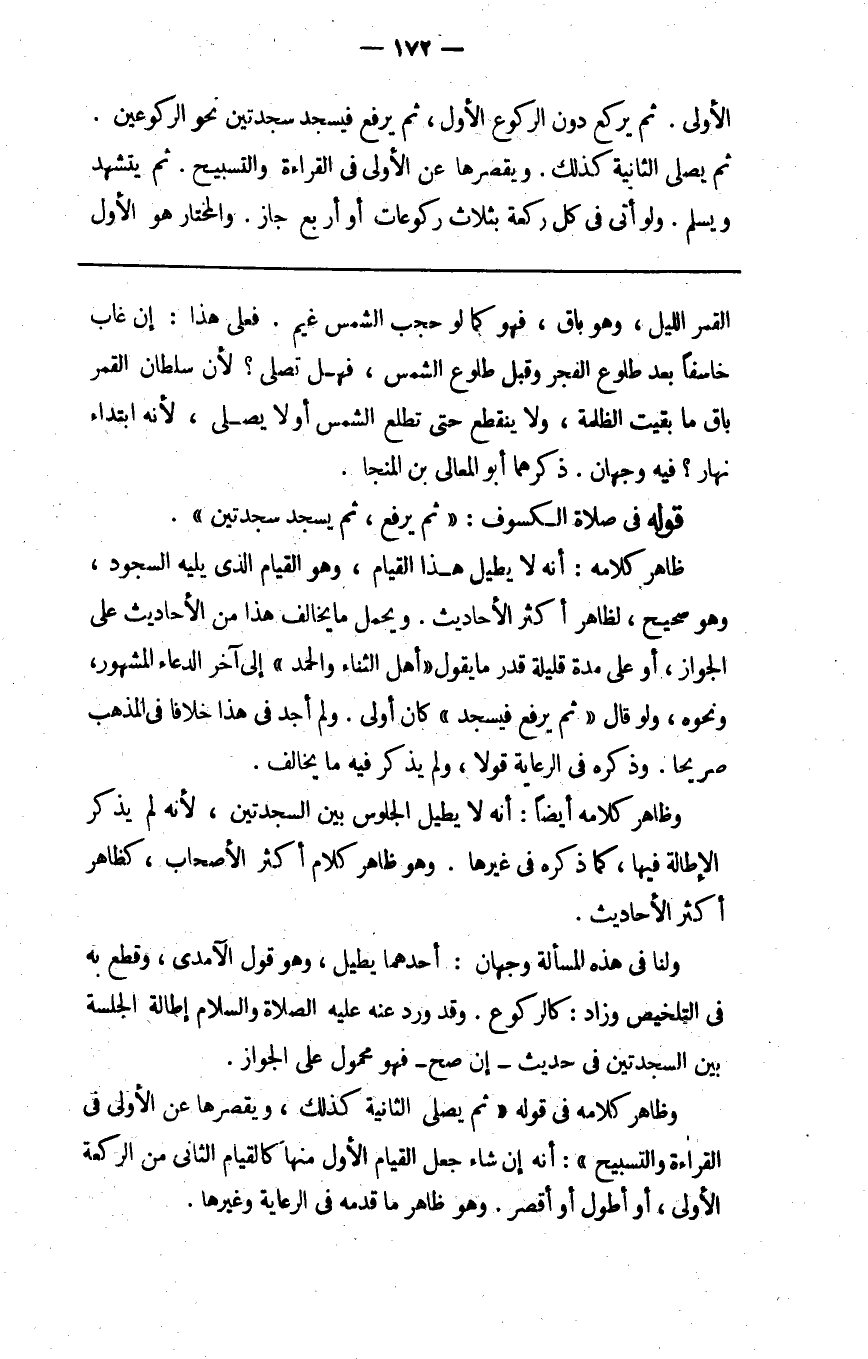 القمر الليل وهو باق فهو كما لو حجب الشمس غيم فعلى هذا إن غاب خاسفا بعد طلوع الفجر وقبل طلوع الشمس فهل تصلي لأن سلطان القمر باق ما بقيت الظلمة ولا ينقطع حتى تطلع الشمس أو لا يصلي لأنه ابتداء نهار فيه وجهان ذكرهما أبو المعالي بن المنجا.