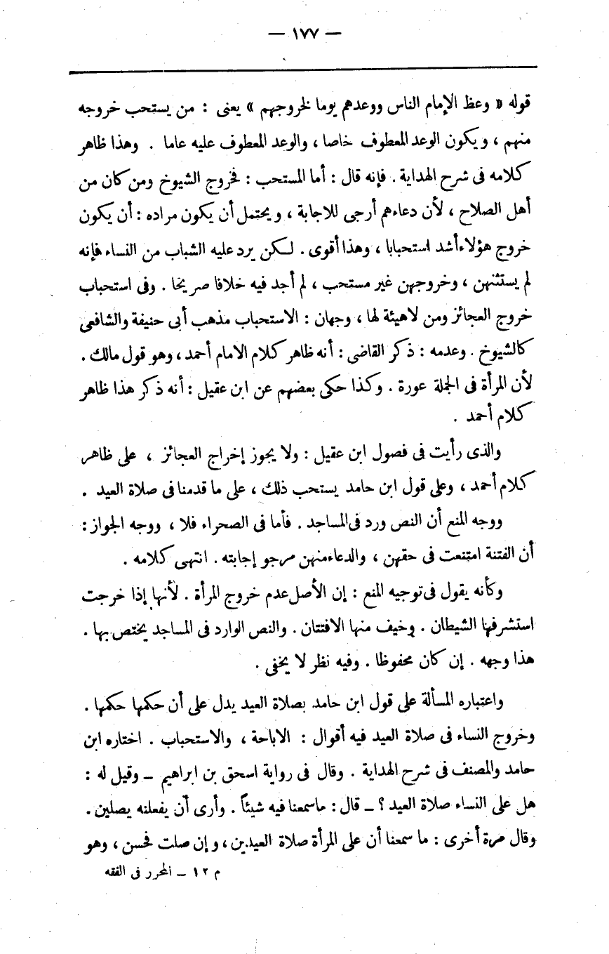 واعتباره المسألة على قول ابن حامد بصلاة العيد يدل على أن حكمها حكمها وخروج النساء في صلاة العيد فيه أقوال الإباحة والاستحباب اختاره ابن حامد والمصنف في شرح الهداية وقال في رواية اسحق بن ابراهيم وقيل له هل على النساء صلاة العيد قال ماسمعنا فيه شيئا وأرى أن يفعلنه يصلين وقال مرة أخرى ما سمعنا أن على المرأة صلاة العيدين وإن صلت فحسن وهو