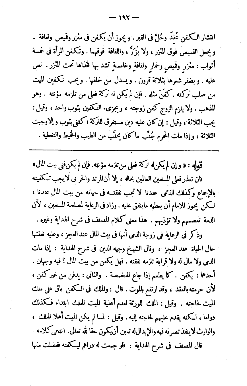 وذكر في الرعاية في زوجة الذمي أنها في بيت المال عند العجز وعليه نفقتها حال الحياة عند العجز وقال الشيخ وجيه الدين في شرح الهداية إذا مات الذمي ولا مال له ولا قرابة تلزمه نفقته فهل يكفن من بيت المال فيه وجهان أحدهما يكفن كما يطعم إذا جاع للمخمصة والثاني يدفن من غير كفن لأن حرمته بالعقد وقد ارتفع بالموت قال والملك في الكفن باق على ملك الميت لحاجته وقيل الملك للورثة لعدم أهلية الميت للملك ابتداء فكذلك دواما لكنه يقدم عليهم لحاجته إليه وقيل لما لم يكن الميت أهلا للملك والوارث لا ينفذ تصرفه فيه والإبدال له تعين أن يكون حقا لله تعالى انتهى كلامه.
