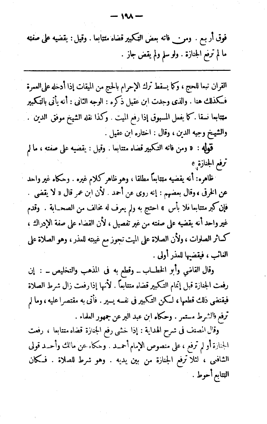 القران تبعا للحج وكما يسقط ترك الإحرام بالحج من الميقات إذا أدخله على العمرة فكذلك هنا والذي وجدت ابن عقيل ذكره الوجه الثاني أنه يأتي بالتكبير متتابعا نسقا كما يفعل المسبوق إذا رفع الميت وكذا نقله الشيخ موفق الدين والشيخ وجيه الدين وقال اختاره ابن عقيل.