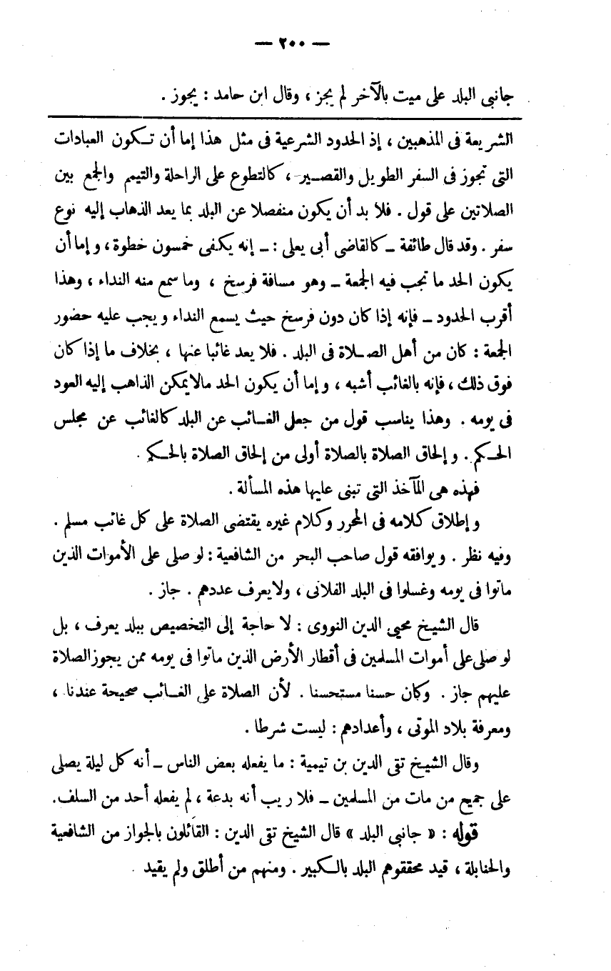 جانبي البلد على ميت بالآخر لم يجز وقال ابن حامد يجوز.