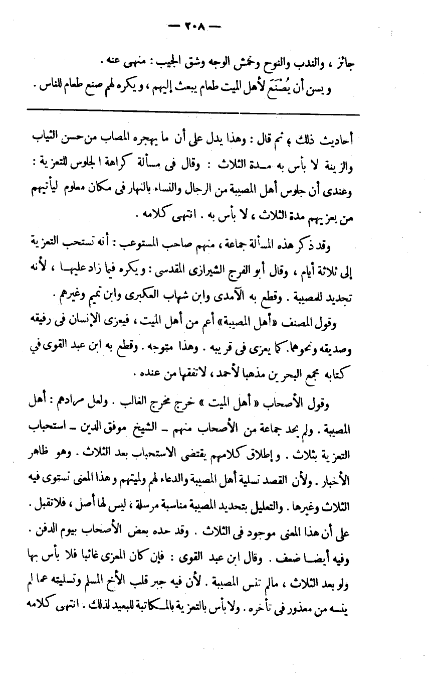 أحاديث ذلك ثم قال وهذا يدل على أن ما يهجره المصاب من حسن الثياب والزينة لابأس به مدة الثلاث وقال في مسألة كراهة الجلوس للتعزية وعندي أن جلوس أهل المصيبة من الرجال والنساء بالنهار في مكان معلوم ليأتيهم من يعزيهم مدة الثلاث لا بأس به انتهى كلامه.