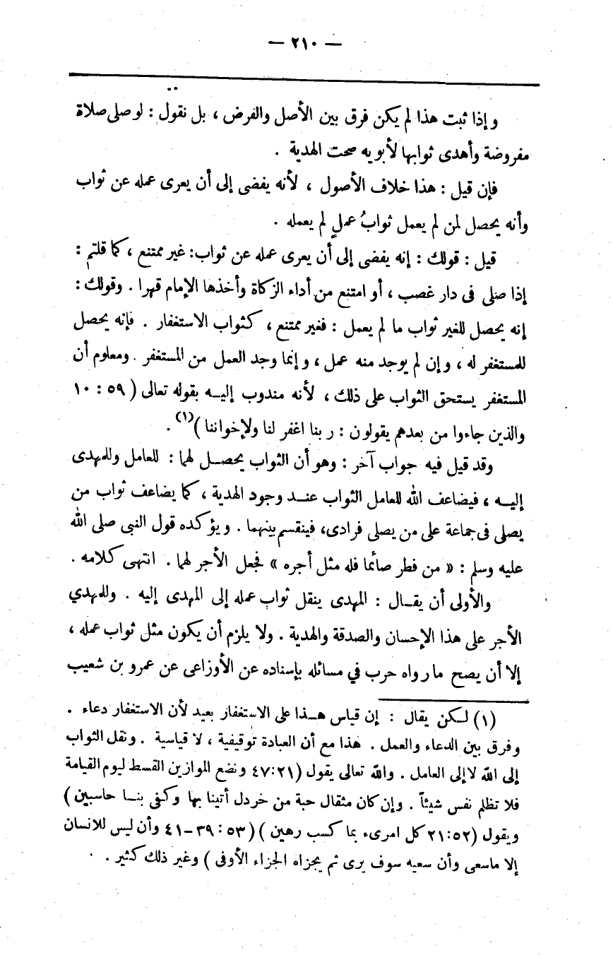 قيل قولك إنه يفضي إلى أن يعرى عمله عن ثواب غير ممتنع كما قلتم إذا صلى في دار غصب أو امتنع من أداء الزكاة وأخذها الإمام قهرا وقولك إنه يحصل للغير ثواب ما لم يعمل فغير ممتنع كثواب الاستغفار فإنه يحصل للمستغفر له وإن لم يوجد منه عمل وإنما وجد العمل من المستغفر ومعلوم أن المستغفر يستحق الثواب على ذلك لأنه مندوب إليه بقوله تعالى {وَالَّذِينَ جَاءُوا مِنْ بَعْدِهِمْ يَقُولُونَ رَبَّنَا اغْفِرْ لَنَا وَلِإِخْوَانِنَا} [الحشر الآية10] 1.