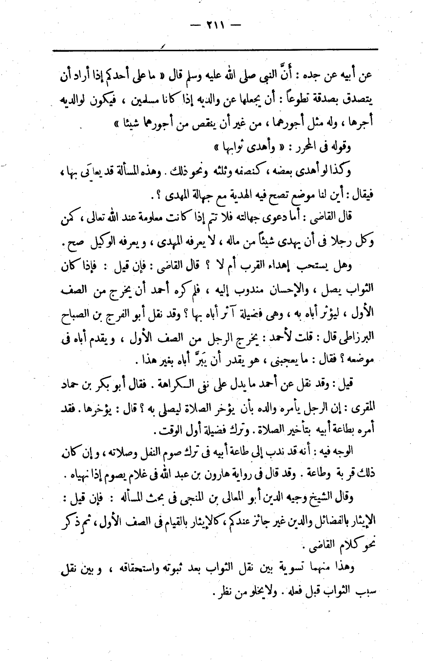 وهل يستحب إهداء القرب أم لا قال القاضي فإن قيل فإذا كان الثواب يصل والإحسان مندوب إليه فلم كره أحمد أن يخرج من الصف الأول ليؤثر أباه به وهي فضيلة آثر أباه بها وقد نقل أبو الفرج بن الصباح البرزاطي قال قلت لأحمد يخرج الرجل من الصف الأول ويقدم أباه في موضعه فقال ما يعجبني هو يقدر أن يبر أباه بغير هذا.