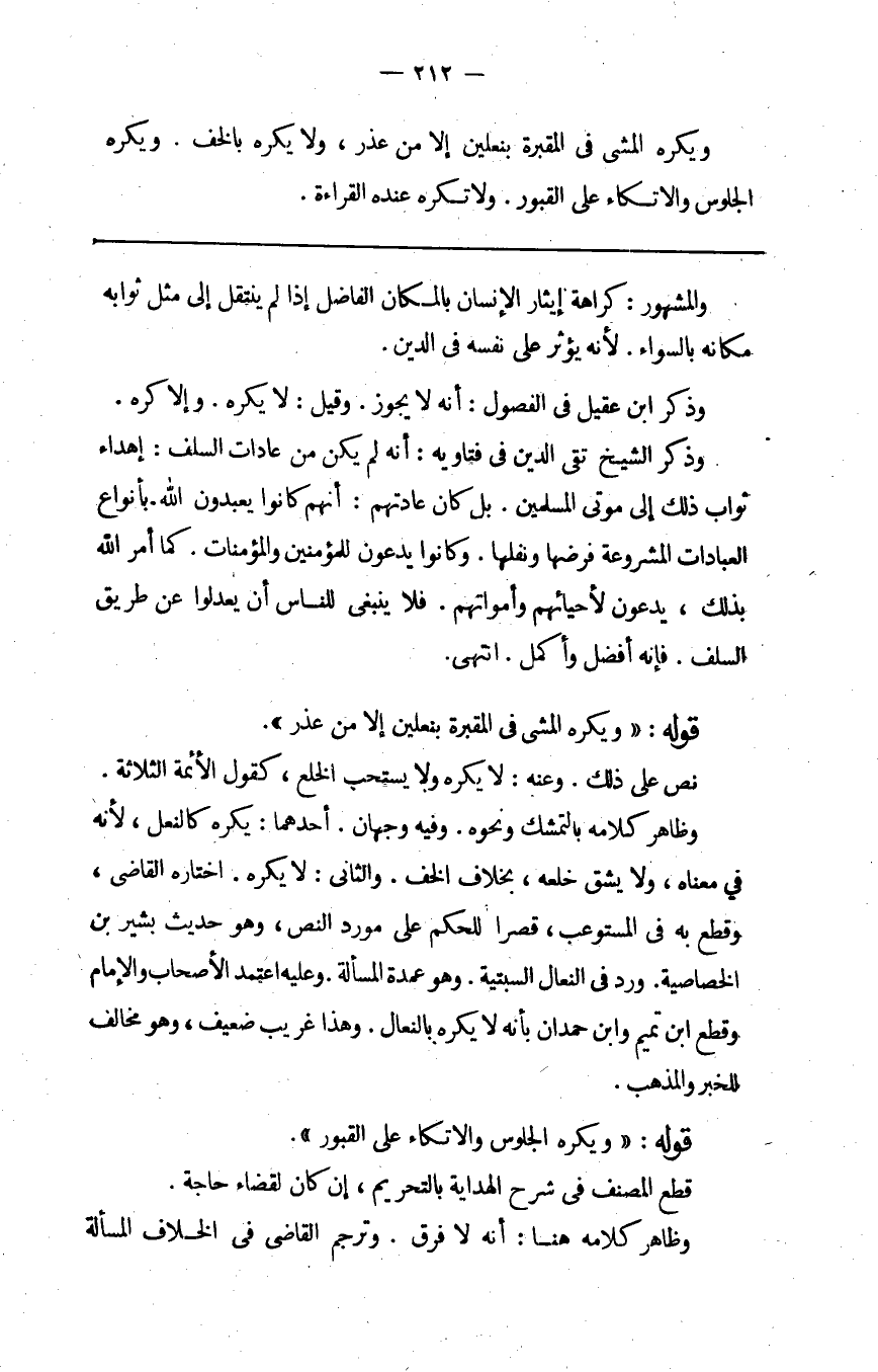 ويكره المشي في المقبرة بنعلين إلا من عذر ولا يكره بالخف ويكره الجلوس والاتكاء على القبور ولا تكره عنده القراءة.