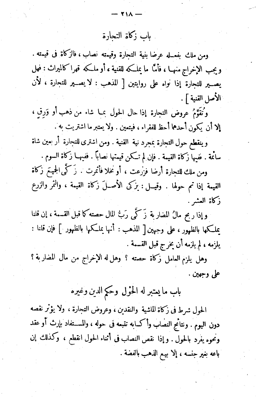 الحول شرط في زكاة الماشية والنقدين وعروض التجارة ولا يؤثر نقصه دون اليوم ونتائج النصاب وأكسابه تتبعه في حوله والمستفاد بإرث أو عقد ونحوه يفرد بالحول وإذا نقص النصاب في أثناء الحول انقطع وكذلك إن باعه بغير جنسه إلا بيع الذهب بالفضة.