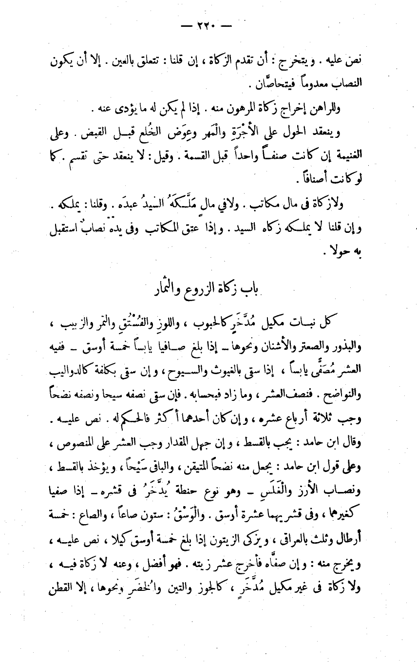 كل نبات مكيل مدخر كالحبوب واللوز والفستق والتمر والزبيب والبذور والصعتر والأشنان ونحوها إذا بلغ صافيا يابسا خمسة أوسق ففيه العشر مصفى يابسا إذا سقى بالغيوث والسيوح وإن سقى بكلفة كالدواليب والنواضح فنصف العشر وما زاد فبحسابه فإن سقى نصفه سيحا ونصفه نضحا وجب ثلاثة أرباع عشره وإن كان أحدهما أكثر فالحكم له نص عليه وقال ابن حامد يجب بالقسط وإن جهل المقدار وجب العشر على المنصوص وعلى قول ابن حامد يجعل منه نضحا المتيقن والباقي سيحا ويؤخذ بالقسط ونصاب الأرز والغلس وهو نوع حنطة يدخر في قشره إذا صفيا كغيرهما وفي قشريهما عشرة أوسق والوسق ستون صاعا والصاع خمسة أرطال وثلث بالعراقي ويزكى الزيتون إذا بلغ خمسة أوسق كيلا نص عليه ويخرج منه وإن صفاه فأخرج عشر زيته فهو أفضل وعنه لا زكاة فيه ولا زكاة في غير مكيل مدخر كالجوز والتين والخضر ونحوها إلا القطن