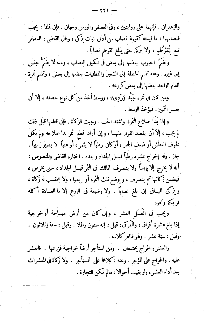 والزعفران فإنهما على روايتين وفي العصفر والورس وجهان فإن قلنا يجب فنصابهما ما قيمته كقيمة نصاب من أدنى نبات يزكى وقال القاضي العصفر تبع للقرطم ولا يزكى حتى يبلغ القرطم نصابا.