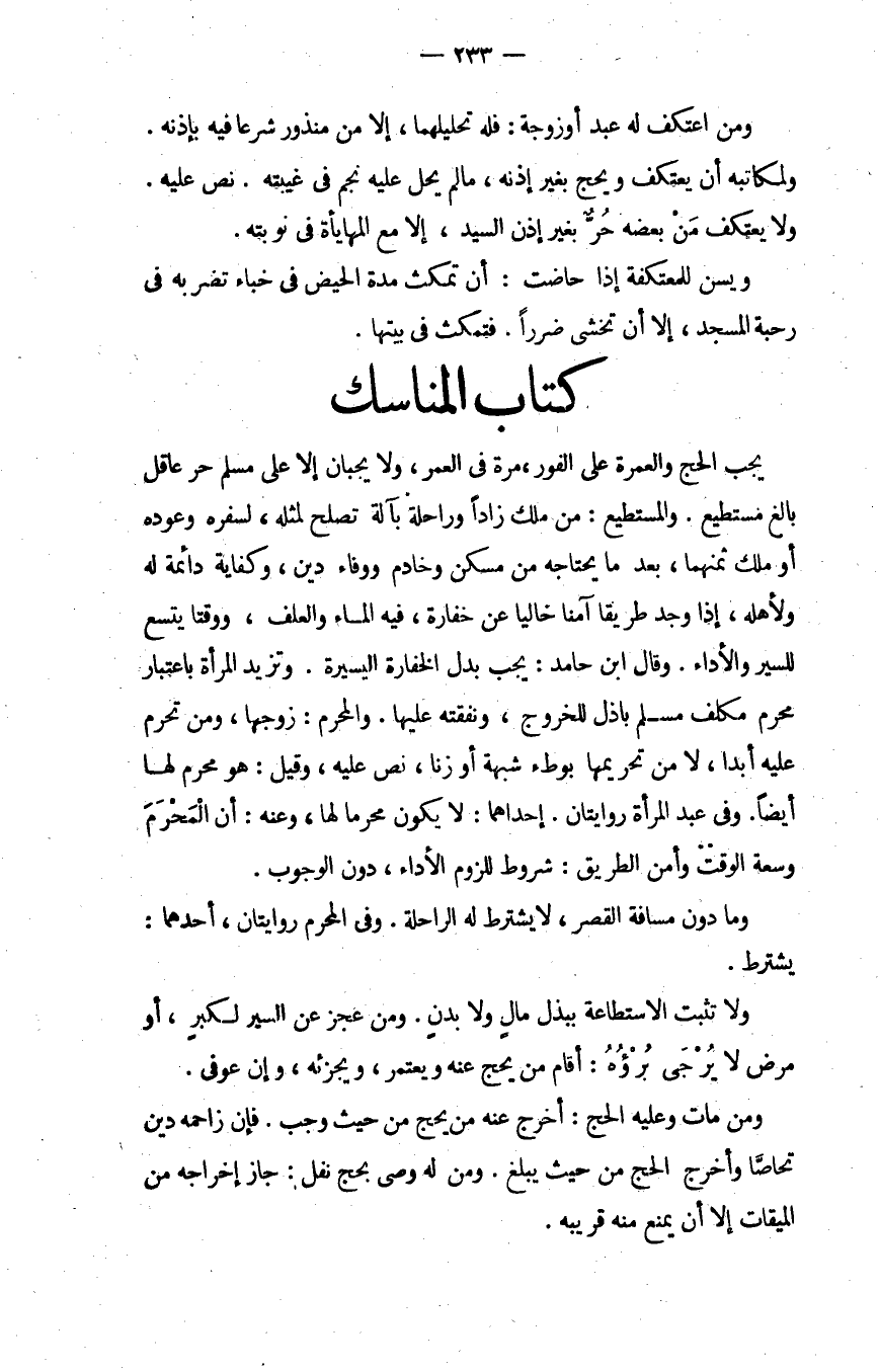 يجب الحج والعمرة على الفور مرة في العمر ولا يجبان إلا على مسلم حر عاقل بالغ مستطيع والمستطيع من ملك زادا وراحلة بآلة تصلح لمثله لسفره وعوده أو ملك ثمنهما بعد ما يحتاجه من مسكن وخادم ووفاء دين وكفاية دائمة له ولأهله إذا وجد طريقا آمنا خاليا عن خفارة فيه الماء والعلف ووقتا يتسع للسير والأداء وقال ابن حامد يجب بدل الخفارة اليسيرة وتزيد المرأة باعتبار محرم مكلف مسلم باذل للخروج ونفقته عليها والمحرم زوجها ومن تحرم عليه أبدا لا من تحريمها بوطء شبهة أو زنا نص عليه وقيل: هو محرم لها أيضا وفي عبد المرأة روايتان إحداهما: لا يكون محرما لها وعنه أن المحرم وسعة الوقت وأمن الطريق شروط للزوم الأداء دون الوجوب.