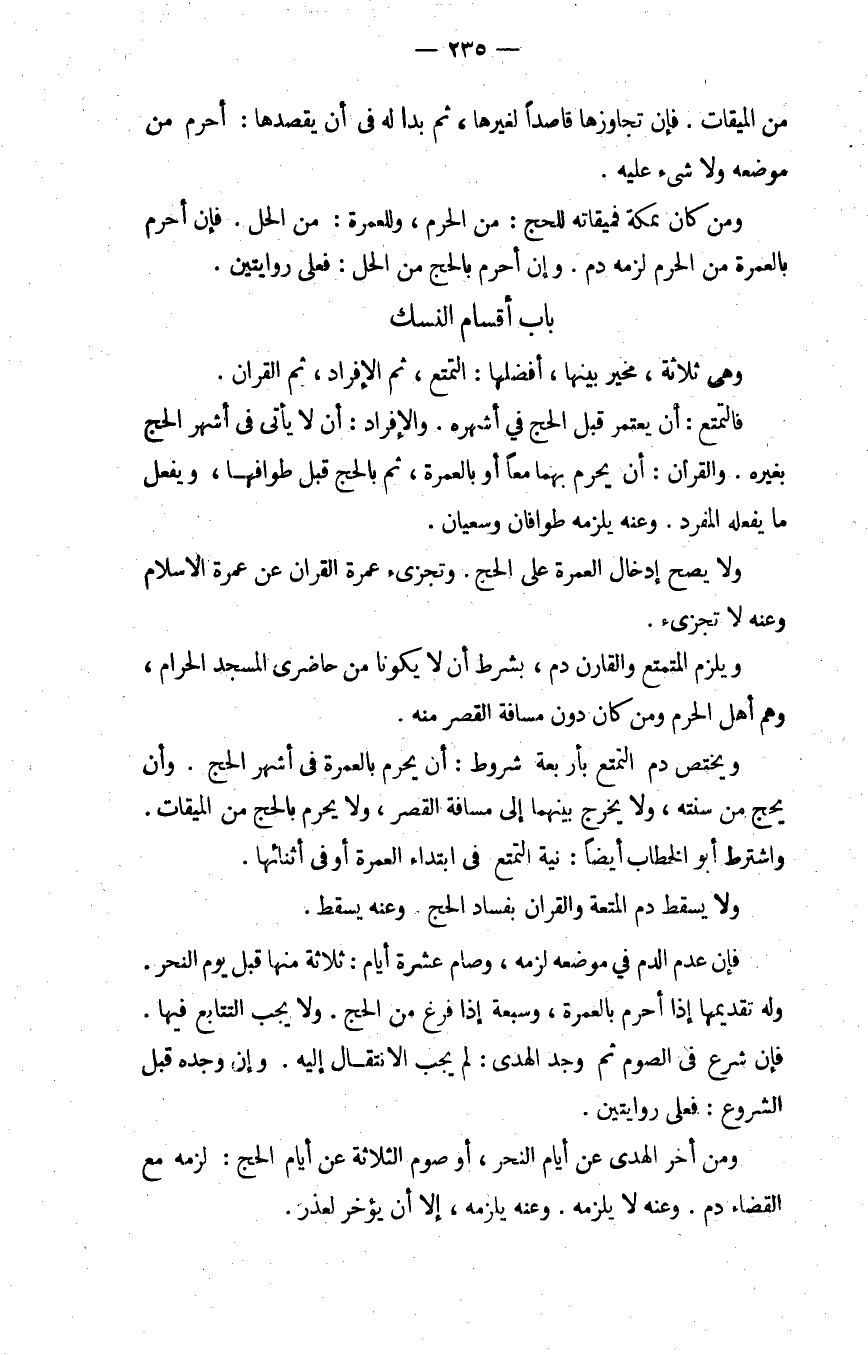 فالتمتع أن يعتمر قبل الحج في أشهره والإفراد أن لا يأتي في أشهر الحج بغيره والقران أن يحرم بهما معا أو بالعمرة ثم بالحج قبل طوافها ويفعل ما يفعله المفرد وعنه يلزمه طوافان وسعيان.