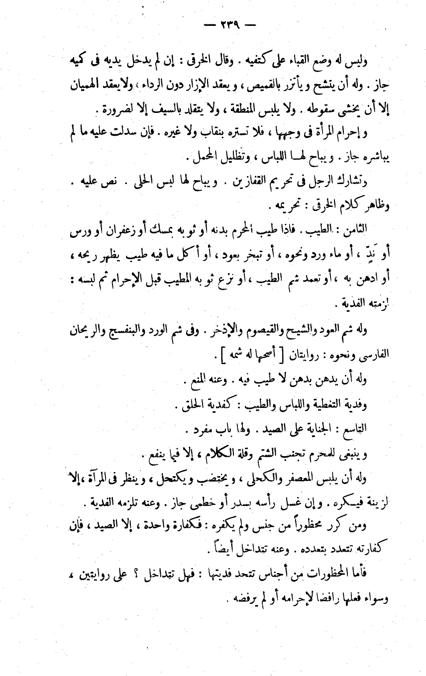 الثامن: الطيب فإذا طيب المحرم بدنه أو ثوبه بمسك أو زعفران أو ورس أو ند أو ماء ورد ونحوه أو تبخر بعود أو أكل ما فيه طيب يظهر ريحه أو ادهن به أو تعمد شم الطيب أو نزع ثوبه المطيب قبل الإحرام ثم لبسه لزمته الفدية.
