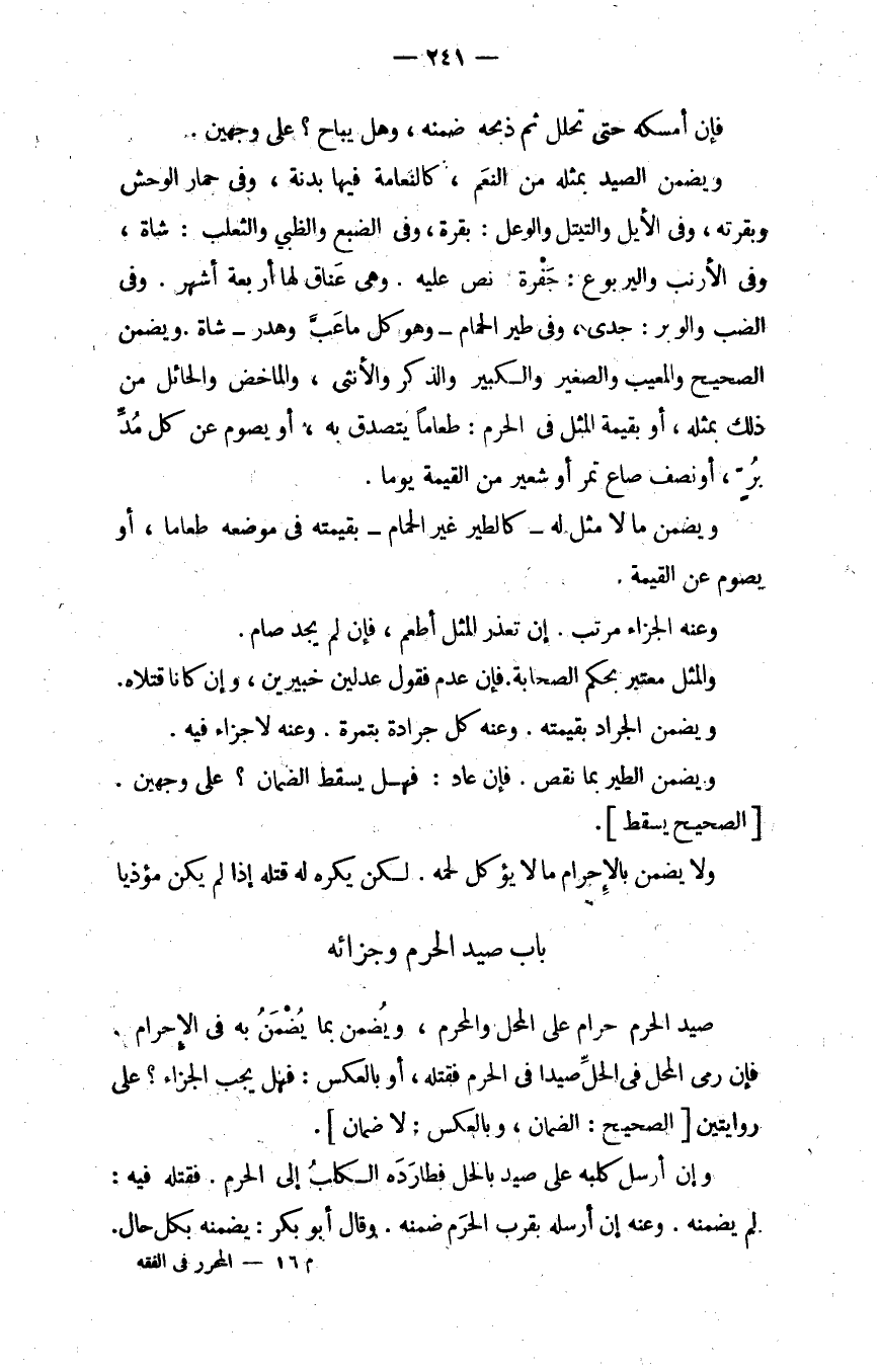 صيد الحرم حرام على المحل والمحرم ويضمن بما يضمن به في الإحرام فإن رمى المحل في الحل صيدا في الحرم فقتله أو بالعكس فهل يجب الجزاء على روايتين [الصحيح الضمان وبالعكس لا ضمان] .