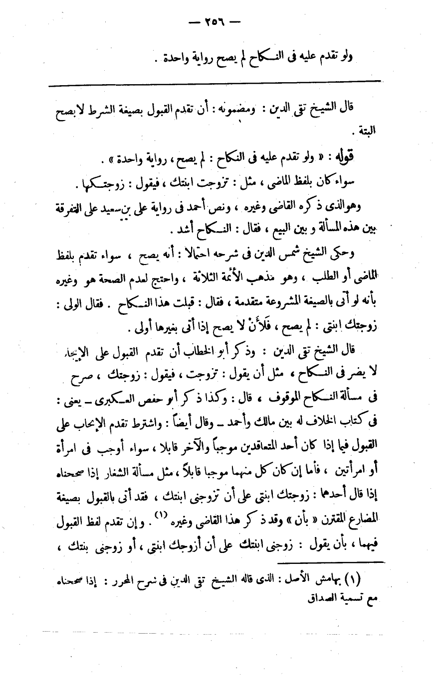 قال الشيخ تقي الدين ومضمونه أن تقدم القبول بصيغة الشرط لا يصح البتة.