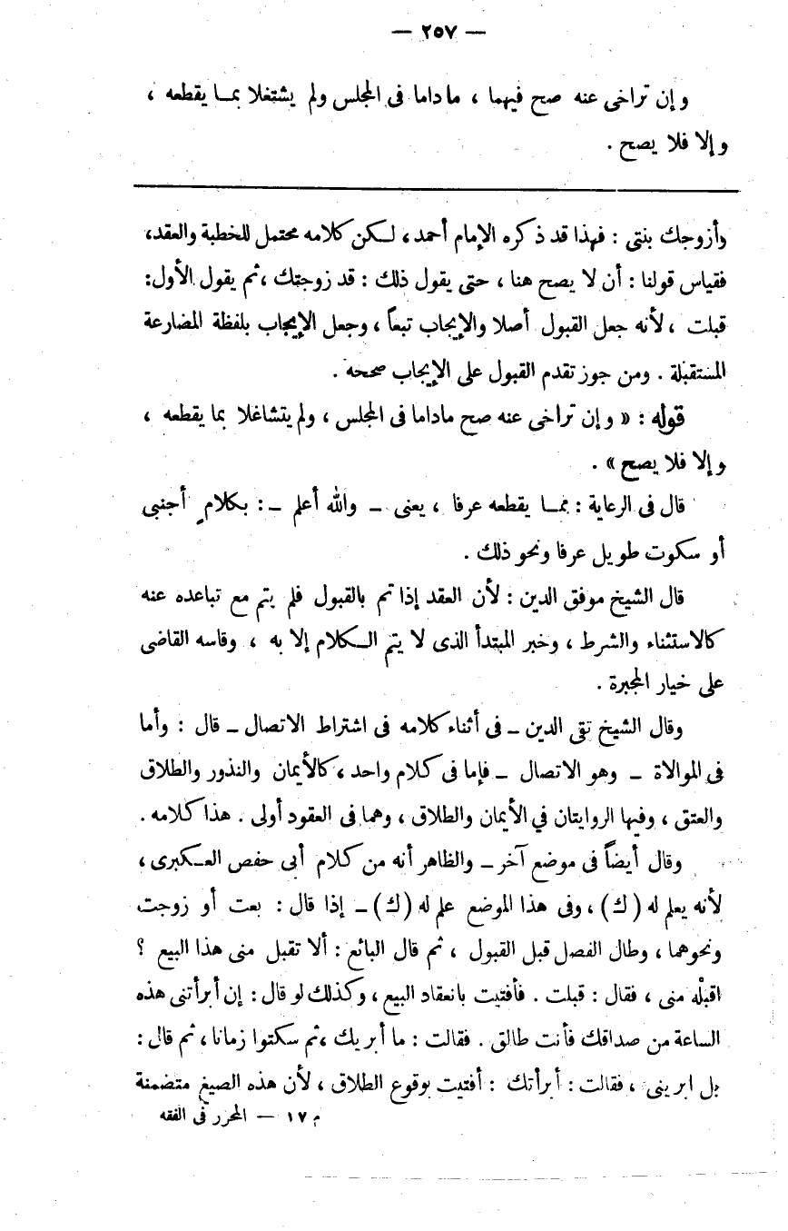 وقال أيضا في موضع آخر والظاهر أنه من كلام أبي حفص العكبري لأنه يعلم له "ك" وفي الموضع علم له "ك" إذا قال بعت أو زوجت ونحوهما وطال الفصل قبل القبول ثم قال البائع ألا تقبل مني هذا البيع اقبله مني فقال قبلت فأفتيت بانعقاد البيع وكذلك لو قال إن أبرأتني هذه الساعة من صداقك فأنت طالق فقالت ما أبريك ثم سكتوا زمانا ثم قال بل ابريني فقالت أبرأتك أفتيت بوقوع الطلاق لأن هذه الصيغ متضمنة