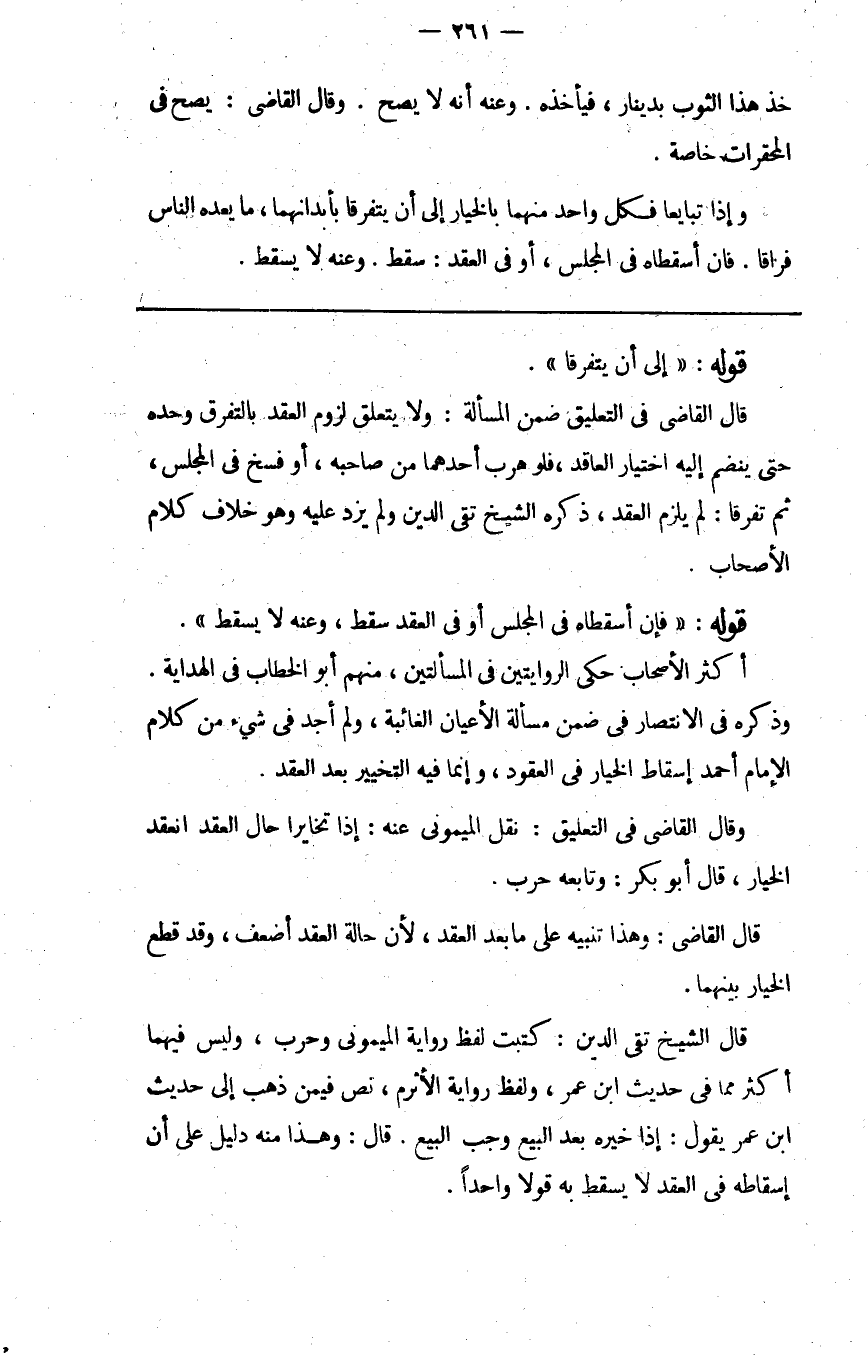 قال الشيخ تقي الدين كتبت لفظ رواية الميموني وحرب وليس فيهما أكثر مما في حديث ابن عمر ولفظ رواية الأثرم نص فيمن ذهب إلى حديث ابن عمر يقول إذا خيره بعد البيع وجب البيع قال وهذا منه دليل على أن إسقاطه في العقد لا يسقط به قولا واحدا.