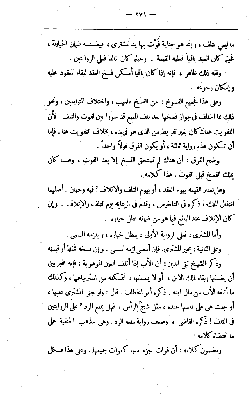 وعلى هذا فجميع الفسوخ من الفسخ بالعيب واختلاف المتبايعين ونحو ذلك مما اختلف في جواز فسخها بعد تلف المبيع قد سووا بين الفوت والتلف لأن التفويت هناك كان بغير تفريط من الذي هو في يده بخلاف التفويت هنا فإما أن تكون هذه رواية ثالثة أو يكون الفرق قولا واحدا.