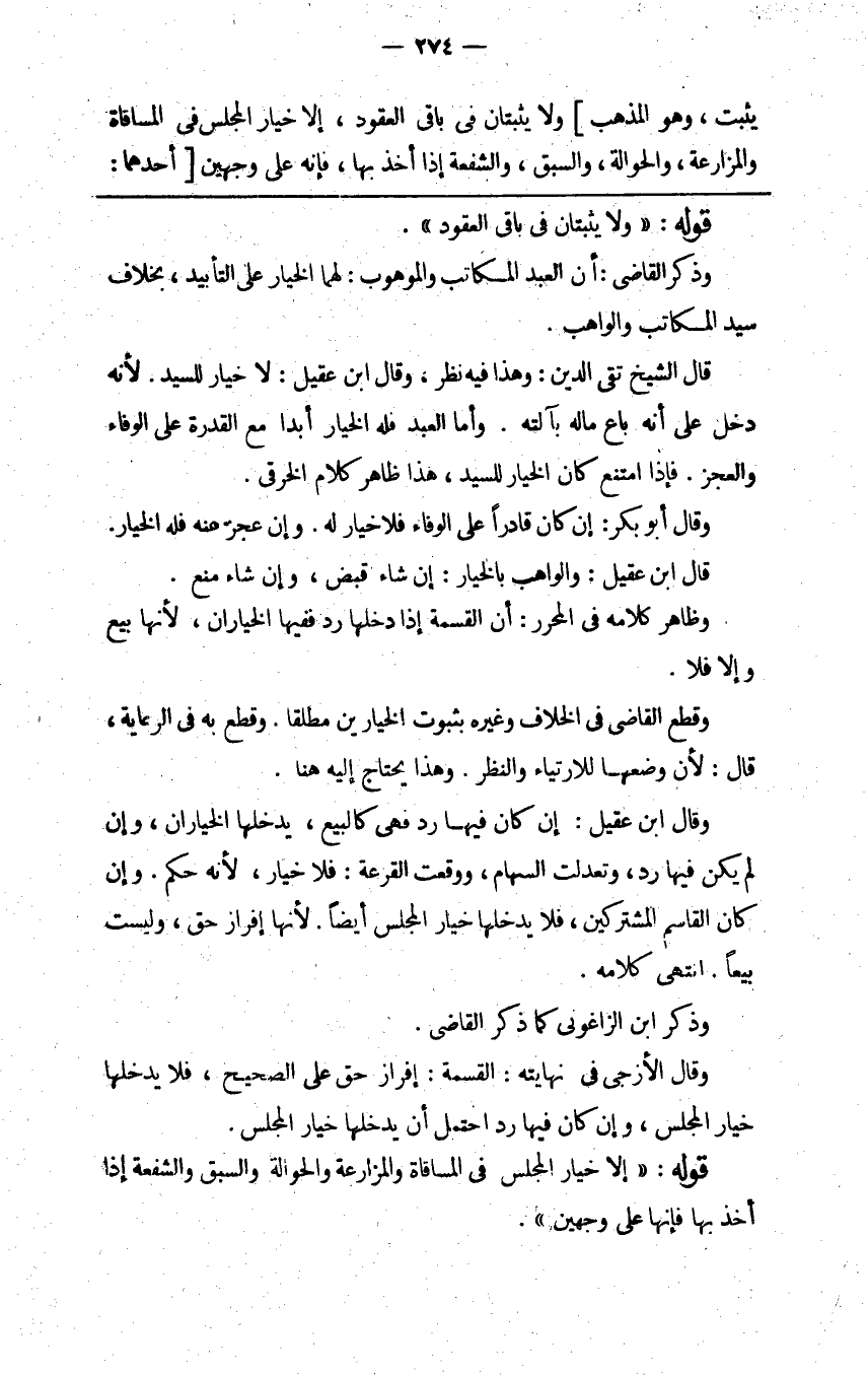 يثبت وهو المذهب] ولا يثبتان في باقي العقود إلا خيار المجلس في المساقاة والمزارعة والحوالة والسبق والشفعة إذا أخذ بها فإنه على وجهين [أحدهما: