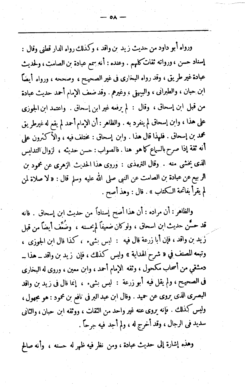 ورواه أبو داود من حديث زيد بن واقد وكذلك رواه الدارقطني وقال إسناد حسن ورواته ثقات كلهم وعنده أنه سمع عبادة بن الصامت ولحديث عبادة غير طريق وقد رواه البخاري في غير الصحيح وصححه ورواه أيضا ابن حبان والطبراني والبيهقي وغيرهم وقد ضعف الإمام أحمد حديث عبادة من قبل ابن إسحاق وقال لم يرفعه غير ابن إسحاق واعتمد ابن الجوزي على هذا وابن إسحاق لم ينفرد به والظاهر أن الإمام أحمد لم يقع له غير طريق محمد بن إسحاق فلهذا قال هذا وابن إسحاق مختلف فيه والأكثرون على أنه ثقة إذا صرح بالسماع كما هو هنا فالصواب حسن حديثه لزوال التدليس الذي يخشى منه وقال الترمذي وروى هذا الحديث الزهري عن محمود بن الربيع عن عبادة بن الصامت عن النبي صلى الله عليه وسلم قال " لا صلاة لمن لم يقرأ بفاتحة الكتاب " قال وهذا أصح.