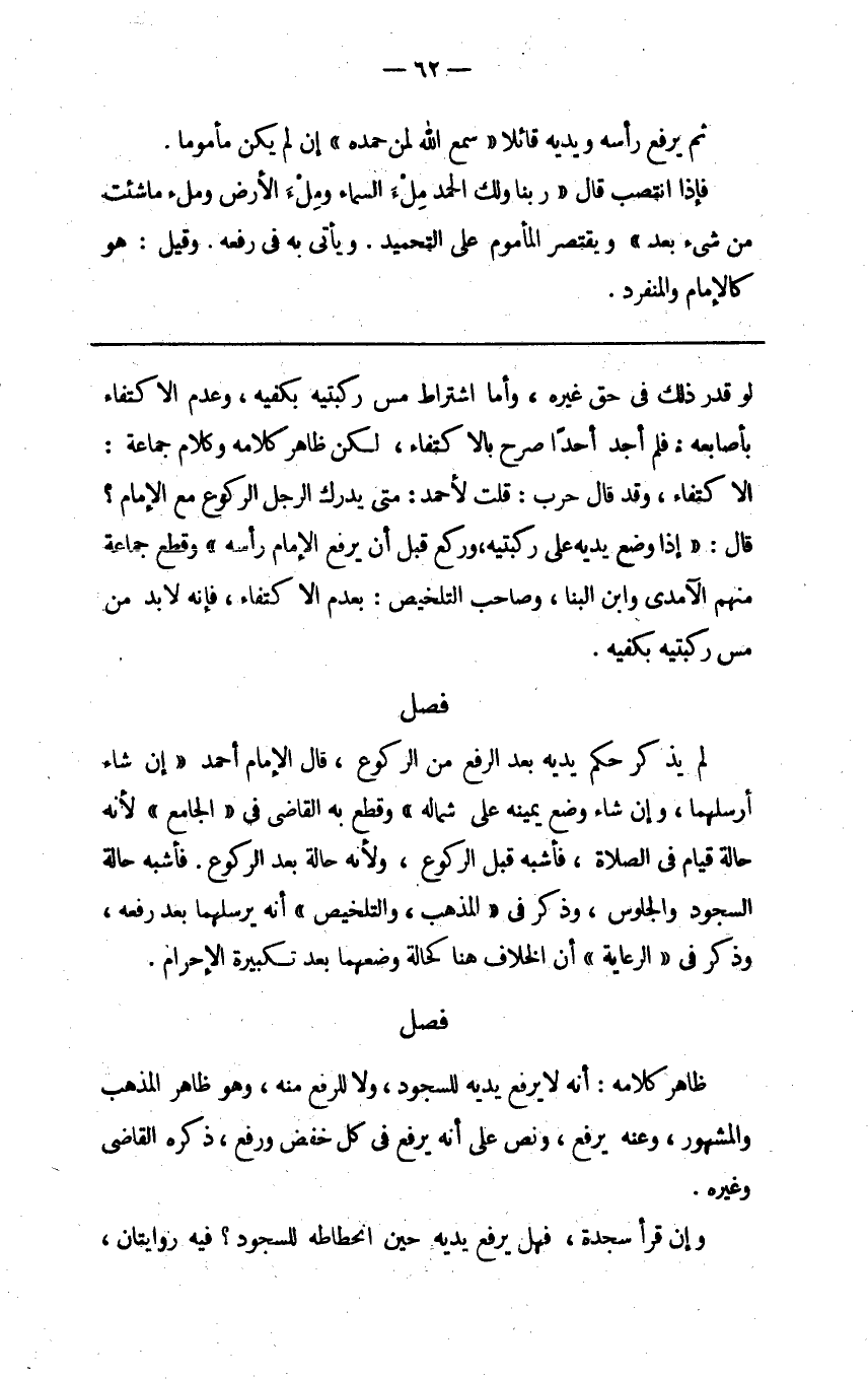 ثم يرفع رأسه ويديه قائلا "سمع الله لمن حمده" إن لم يكن مأموما.