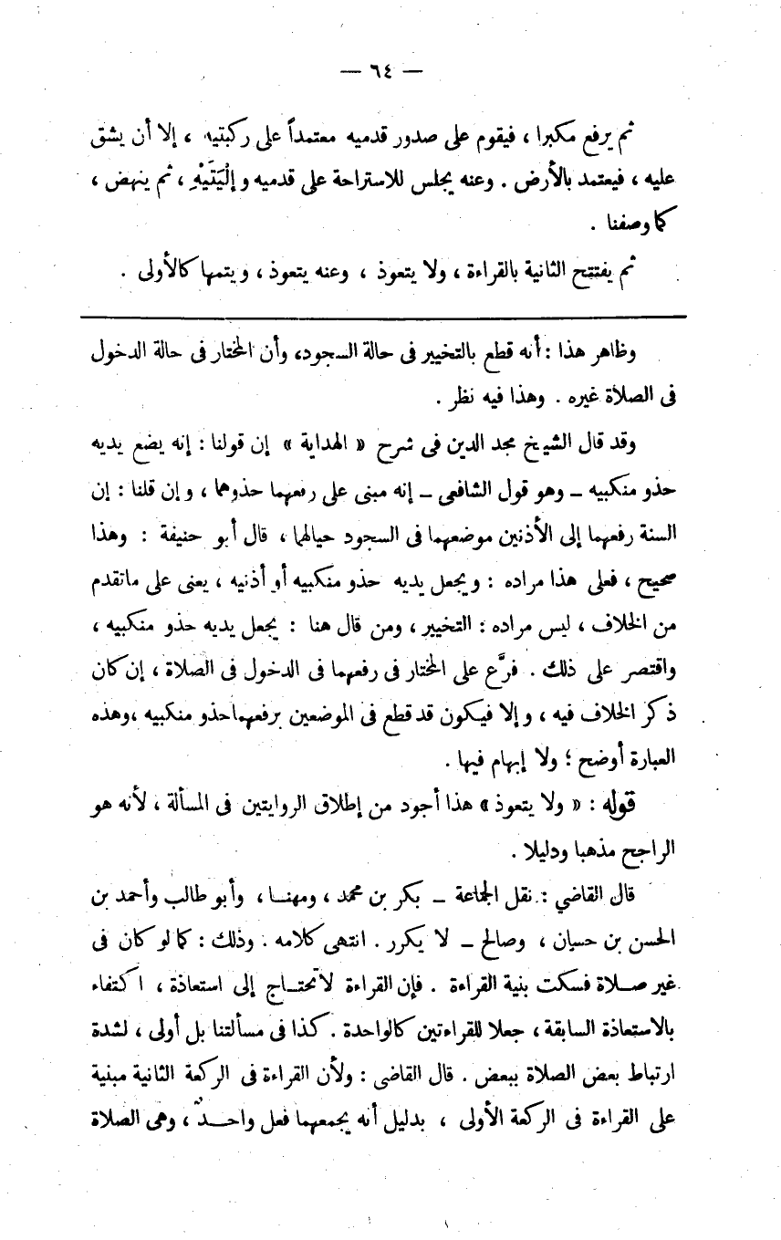 قال القاضي نقل الجماعة بكر بن محمد ومهنا وأبو طالب وأحمد بن الحسن بن حسان وصالح لا يكرر انتهى كلامه وذلك كما لو كان في غير صلاة فسكت بنية القراءة فإن القراءة لا تحتاج إلى استعاذة اكتفاء بالاستعاذة السابقة جعلا للقراءتين كالواحدة كذا في مسألتنا بل أولى لشدة ارتباط بعض الصلاة ببعض قال القاضي ولأن القراءة في الركعة الثانية مبنية على القراءة في الركعة الأولى بدليل أنه يجمعهما فعل واحد وهي الصلاة