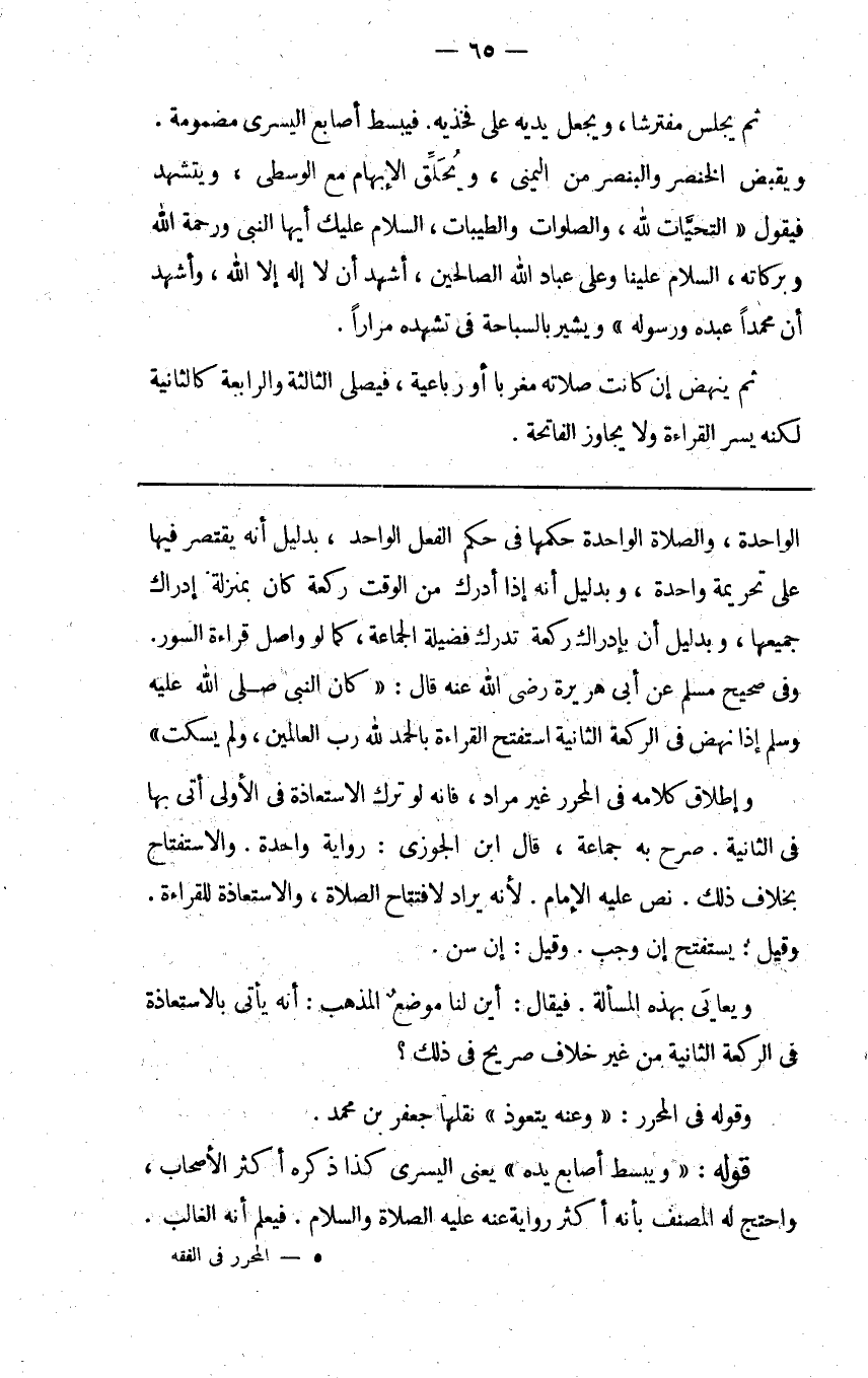 الواحدة والصلاة الواحدة حكمها في حكم الفعل الواحد بدليل أنه يقتصر فيها على تحريمة واحدة وبدليل أنه إذا أدرك من الوقت ركعة كان بمنزلة إدراك جميعها وبدليل أن بإدراك ركعة تدرك فضيلة الجماعة كما لو واصل قراءة السور وفي صحيح مسلم عن أبي هريرة رضي الله عنه قال: كان النبي صلى الله عليه وسلم إذا نهض في الركعة الثانية استفتح القراءة بالحمد لله رب العالمين ولم يسكت
