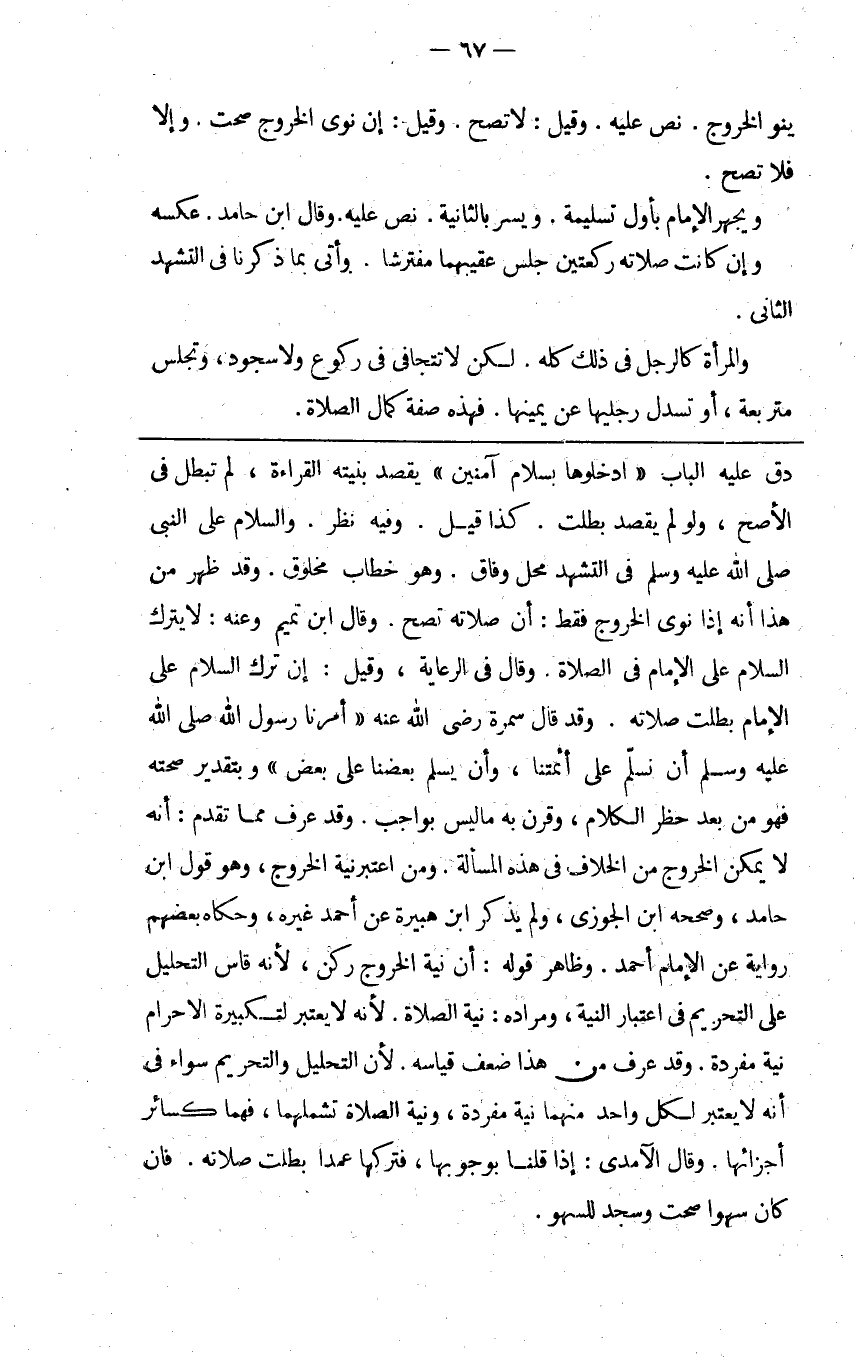 دق عليه الباب "ادخلوها بسلام آمنين" يقصد بنيته القراءة لم تبطل في الأصح ولو لم يقصد بطلت كذا قيل وفيه نظر والسلام على النبي صلى الله عليه وسلم في التشهد محل وفاق وهو خطاب مخلوق وقد ظهر من هذا أنه إذا نوى الخروج فقط أن صلاته تصح وقال ابن تميم وعنه لا يترك السلام على الإمام في الصلاة وقال في الرعاية وقيل: إن ترك السلام على الإمام بطلت صلاته وقد قال سمرة رضي الله عنه " أمرنا رسول الله صلى الله عليه وسلم أن نسلم على أئمتنا وأن يسلم بعضنا على بعض " وبتقدير صحته فهو من بعد حظر الكلام وقرن به ما ليس بواجب وقد عرف مما تقدم أنه لا يمكن الخروج من الخلاف في هذه المسألة ومن اعتبر نية الخروج وهو قول ابن حامد وصححه ابن الجوزي ولم يذكر ابن هبيرة عن أحمد غيره وحكاه بعضهم رواية عن الإمام أحمد وظاهر قوله: أن نية الخروج ركن لأنه قاس التحليل على التحريم في اعتبار النية ومراده نية الصلاة لأنه لا يعتبر لتكبيرة الإحرام نية مفردة وقد عرف من هذا ضعف قياسه لأن التحليل والتحريم سواء في أنه لا يعتبر لكل واحد منهما نية مفردة ونية الصلاة تشملهما فهما كسائر أجزائها وقال الآمدي إذا قلنا بوجوبها فتركها عمدا بطلت صلاته فإن كان سهوا صحت وسجد للسهو.
