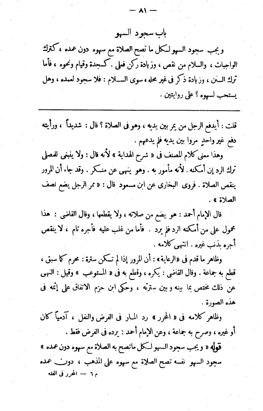 وظاهر كلامه في المحرر رد المار في الفرض والنفل آدميا كان أو غيره وصرح به جماعة وعن الإمام أحمد يرده في الفرض فقط.