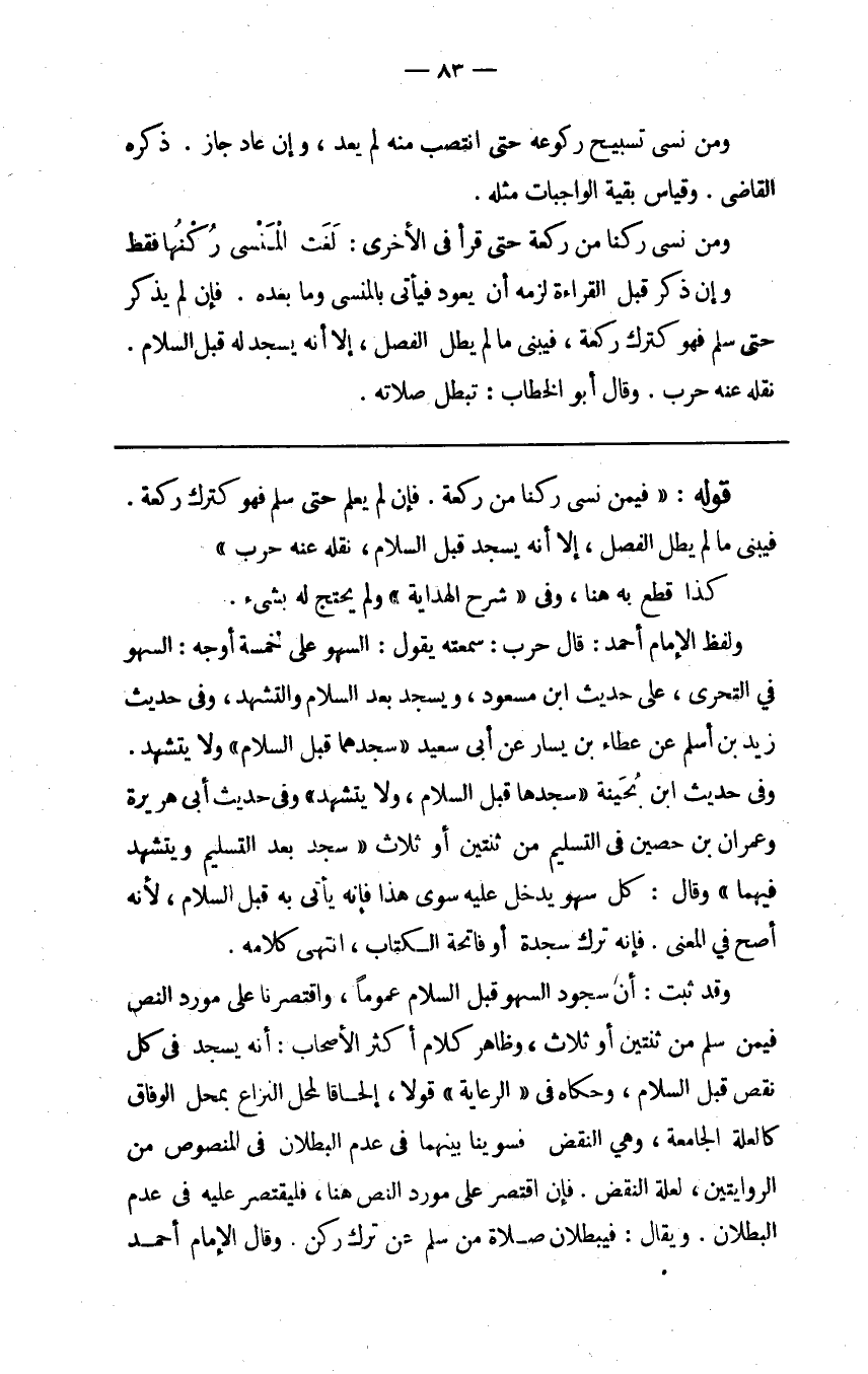ولفظ الإمام أحمد قال حرب سمعته يقول السهو على خمسة أوجه السهو في التحري على حديث ابن مسعود ويسجد بعد السلام والتشهد وفي حديث زيد بن أسلم عن عطاء بن يسار عن أبي سعيد سجدهما قبل السلام ولا يتشهد.