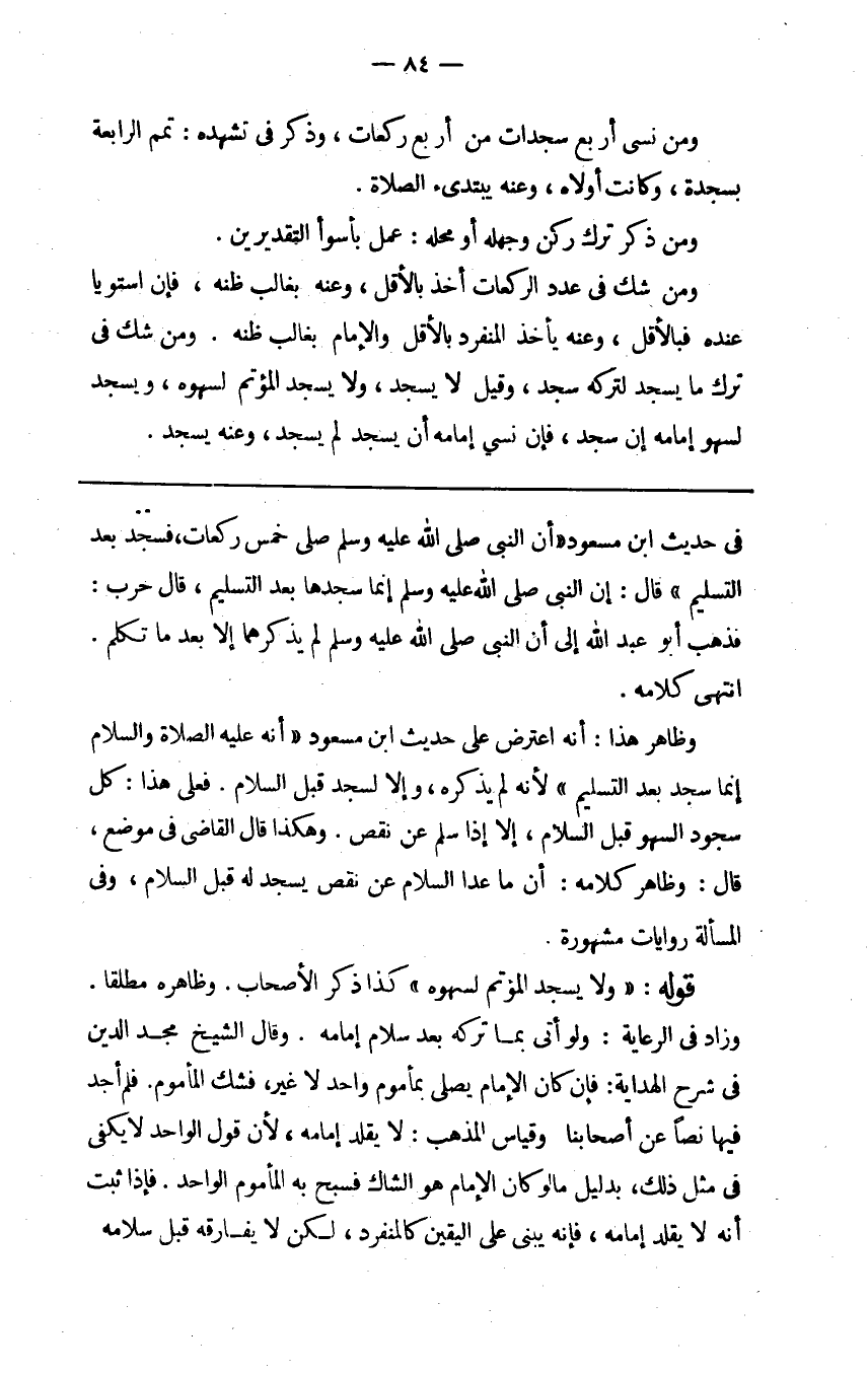 وظاهر هذا أنه اعترض على حديث ابن مسعود أنه عليه الصلاة والسلام إنما سجد بعد التسليم لأنه لم يذكره وإلا لسجد قبل السلام فعلى هذا كل سجود السهو قبل السلام إلا إذا سلم عن نقص وهكذا قال القاضي في موضع قال وظاهر كلامه أن ما عدا السلام عن نقص يسجد له قبل السلام وفي المسألة روايات مشهورة.