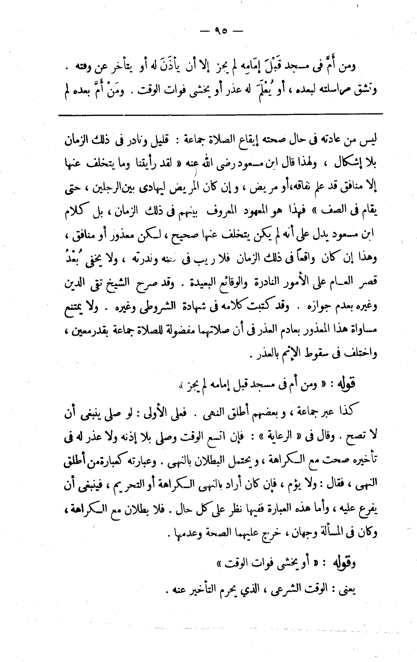 ومن أم في مسجد قبل إمامه لم يحز إلا أن يأذن له أو يتأخر عن وقته وتشق مراسلته لبعده أو يعلم له عذرا أو يخشى فوات الوقت ومن أم بعده لم