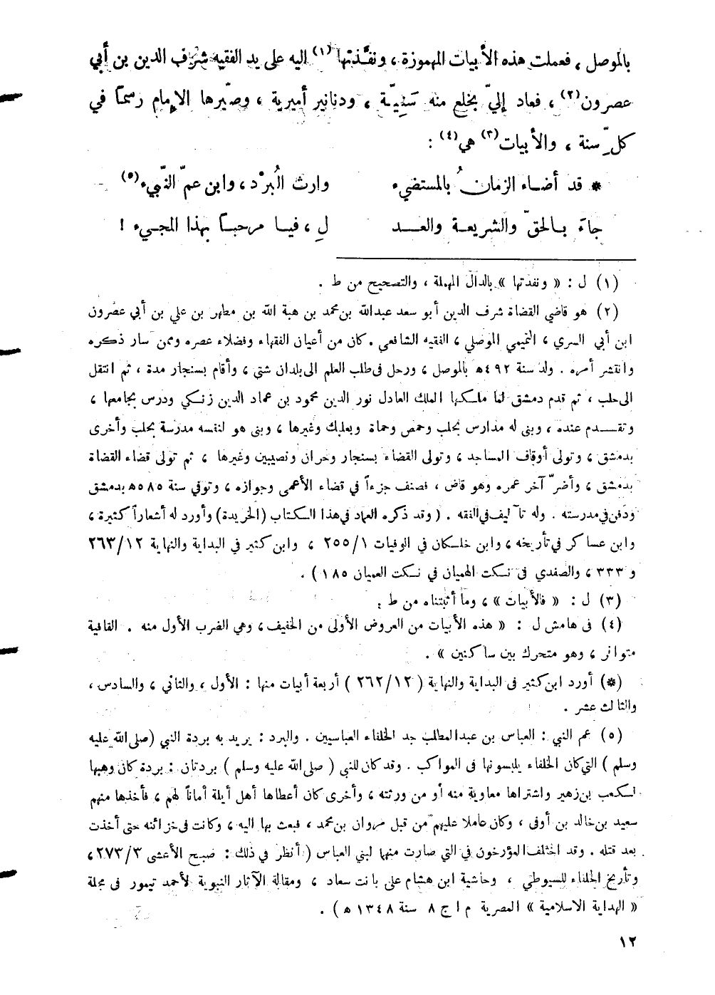 وهو هبة الله ابن صاحب الخبر، الحسن بن علي. رباه خاله، وكتب بين يديه في ديوان الإنشاء في الأيام القائمية والمقتدية والمستظهرية. أسلم مع خاله على يد الإمام المقتدي. وكان لما أضرّ خاله، يكتب عنه ما جرت به العادة من الإنهاءات، فلما توفي خاله، رد ديوان الإنشاء إليه في الأيام المتسظهرية. وخرج في الرسالة إلى السلاطين مراراً وعاد من الرسالة إلى بركيارق - بعد موته - إلى بغداد. وتوفي حادي عشر جمادى