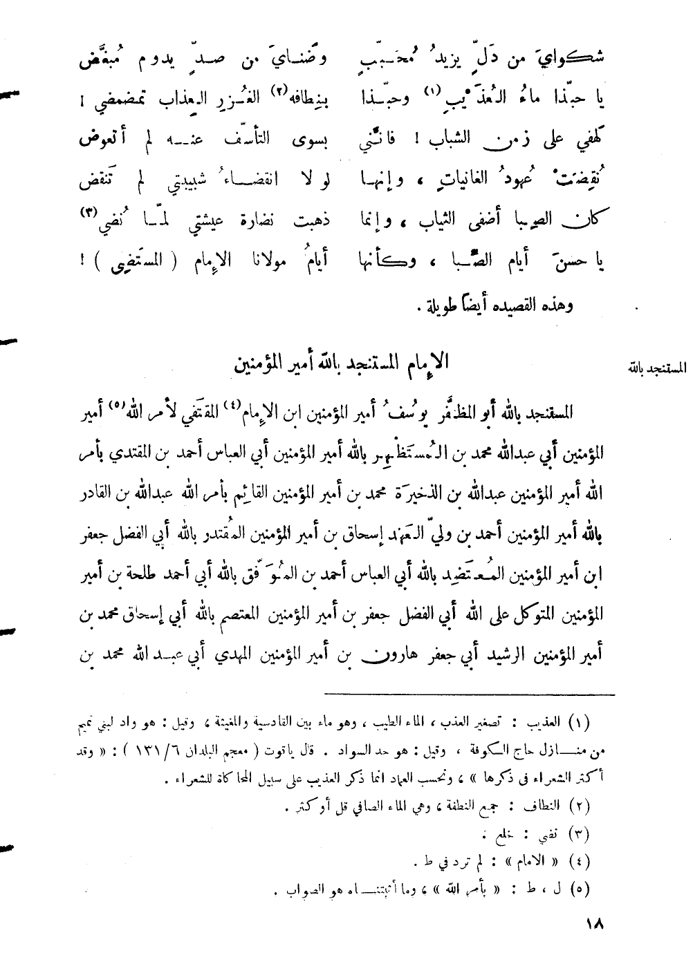 هذا اللُّغز في دولاب الماء. والحائم: العطشان يطلب الماء وقوله: انتدى وابتدا من التجنيس المصحف. وقوله: بادره في آخر الدّورِ ذَرْع القيْ. في نهاية حُسن الاستعارة، والعبارة كناية عن صّب الماء الذي ملأ كوزَه منه. واليعملة: هي الماء الّذي تدريه. والذفوفة: السريعة. والخبب: ضرب من السّير. والحَيص: الميل وطلب الهرب. وقوله: راكبها، الهاء راجعة إلى اليعملة. والراكب: الدولاب. والعنس: الناقة، وهي هاهنا الماء. وإذا امتطاه جد به نشاط الحركة؛ وإن نزل عنه الماء عطب. والمنصلت: العاري. وقوله: يناضل الغيث، أي يراميه ونضاله: صب الماء.