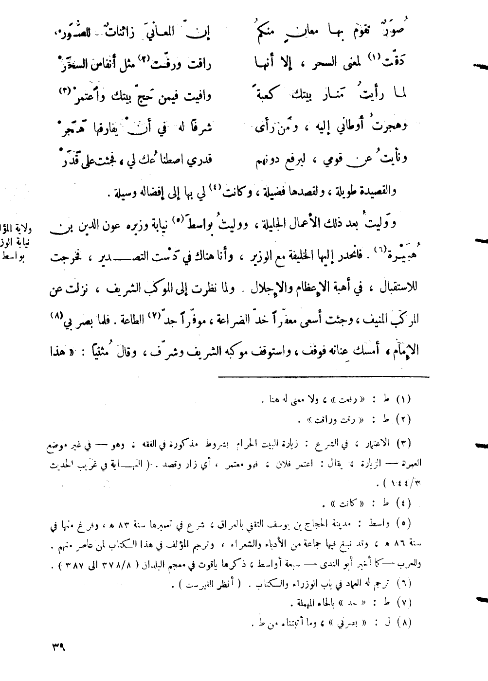 (وله إلى ابن عمه شهاب الدين، وقد رزق ولداً: عرفت أطال الله بقاك مقدم القادم الميمونة غرته، المأمولة رؤيته، الطالع في سماء مجده هلالاً، الناطقة شواهده بأنه يصير بدراً يملأ العيون جمالاً وكمالاً، فتضاعف تصيبي من المسرة به والاستبشار، ووددت أن تمتد يدي عند الورود به إلى النثار، وشكرت الله على هذه الموهبة النفيسة التي زاد بها عدد هذا البيت فتزينوا بجمالها، وترشحوا للتكثير بها وبأمثالها، والخالق المصور بفضل حكمته يجعله على فطرة الحكمة وعلى الهمة مولوداً، وفي مهاد السيادة والزيادة ممهوداً، وفي الخير والصلاح ناشياً، وإلى رتب النهى والعلى كل يوم صاعداً راقياً، وأن يجعله لبيباً نجيباً، وإلى كل القلوب قريباً حبيباً، ويتبعه بأخوة بدور، يقرون الأعين ويشرحون الصدور، ويملأون الأفنية والدور والمجالس والصدور، ليقوى بهم أزره، ويبقى إلى آخر الدهر صيته وذكره، ويرزق الاستمتاع بهذا الولد السار البار، وبما سيتلوه من الأولاد الصغار والكبار، موقى فيهم كل ما يخافه ويحذره، ملقي منهم