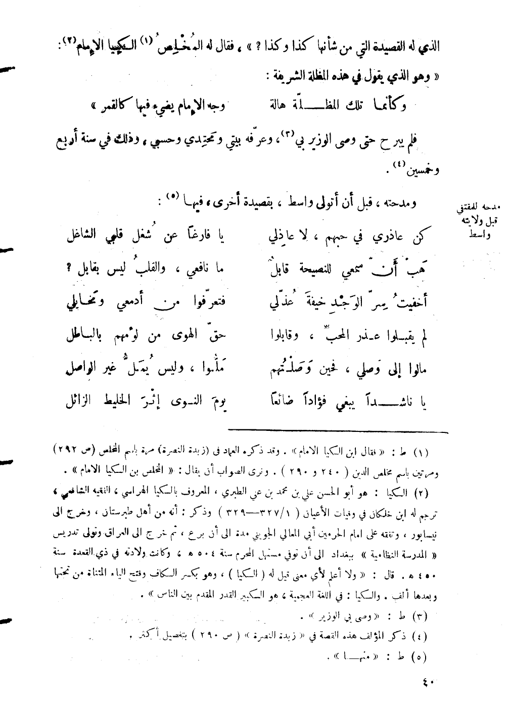 ولولا أن شكل الزمان وشغل القلب الشاغل بالأهل والأوطان، يقيدان ذا الصبابة عن الخفوف، إلى من هو به صب مشغوف، والقدوم، على من يشتري يوم وصاله بالنوم وانضاء الركائب وعناء الجسوم، لكنت أجعل مقيلي دائماً لديه، ورحيلي وافداً من منزلي عليه، ومن حضرته إليه. وها أنا مذ الآن مجدّ في قصده، وآخذٌ أهب المسير