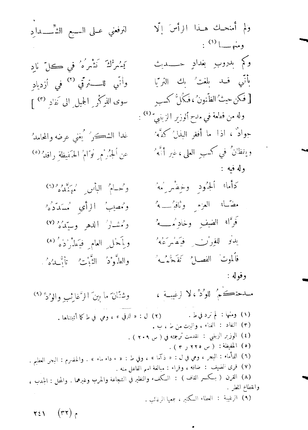 أخرى: إني وإن كنت على قومك يا ابن الكرام حران الفؤاد، محتدم الحفيظة، حيث لفظوا ودي، ونقضوا عهدي، وأخلفوا وعدي، ولم أجزهم بغير الهجران بقية الزمان، وعما سواه فمخزون اللسان، إذ الإخاء معتصمهم المنيع مني. ولعمر الله أنهم يرادون مني طوداً أيهم، ويجدون عوداً ثفالاً لا يهفو في وداد هفوة، ولا تطيش له في ذكرهم بالغيب حبوة، ولكن رب هجر أقتل من هجر. وأنت بنجوة عما اجترحوا، وحجرة عما