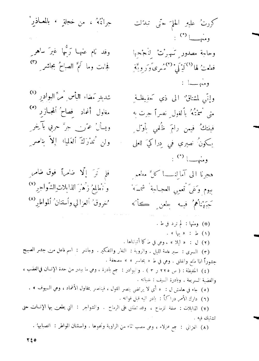 ومن أخرى: أصلح الله أمير المؤمنين، إن الموصل والإيغارين وهما الآن إقطاع لملكين سلجوقيين كانتا إجازتين للطائيين، من إمامين مرضيين: معتصم بالله، ومتوكل على الله. وبناء المجد الأشرف أعظم، وخطره أجسم، وغمامه للمعتفين أرزم، فعلام الحرمان؟ وله: أسبغ الله ظلاله ما افترق الحظ والعلم، واصطحب العقل والهم.