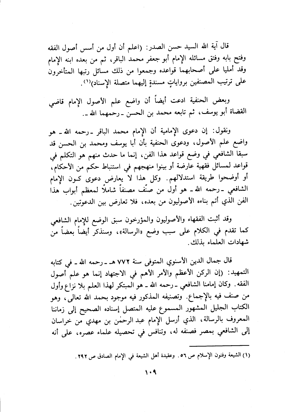 ونقول: إن دعوى الإِمامية أن الإمام محمد الباقر - رحمه الله - هو واضع علم الأصول، ودعوى الحنفية بأن أبا يوسف ومحمد بن الحسن قد سبقا الشافعي في وضع قواعد هذا الفن، إنما ما حدث منهم هو التكلم في قواعد لمسائل فقهية عارضة أو بينوا منهجهم في استنباط حكم من الأحكام،