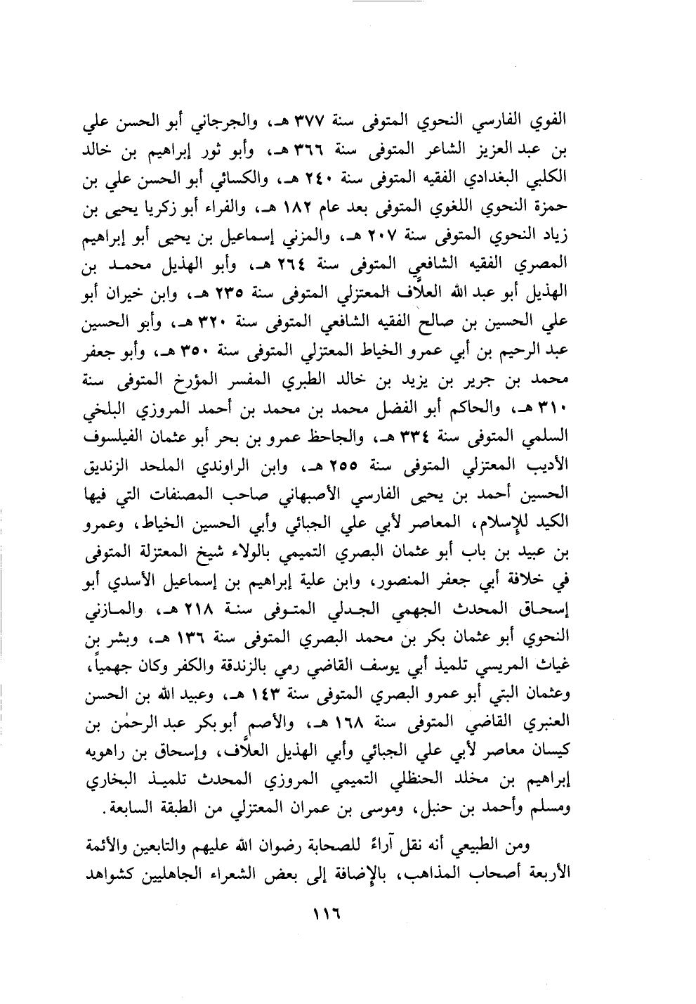 الأديب المعتزلي المتوفى سنة ٢٥٥ هـ، وابن الراوندي الملحد الزنديق الحسين أحمد بن يحيى الفارسي الأصبهاني صاحب المصنفات التي فيها الكيد للإِسلام، المعاصر لأبي علي الجبائي وأبي الحسين الخياط، وعمرو بن عبيد بن باب أبو عثمان البصري التميمي بالولاء شيخ المعتزلة المتوفى في خلافة أبي جعفر المنصور، وابن علية إبراهيم بن إسماعيل الأسدي أبو إسحاق المحدث الجهمي الجدلي المتوفى سنة ٢١٨ هـ، والمازني النحوي أبو عثمان بكر بن محمد البصري المتوفى سنة ١٣٦ هـ، وبشر بن غياث المريسي تلميذ أبي يوسف القاضي رمي بالزندقة والكفر وكان جهمياً، وعثمان البتي أبو عمرو البصري المتوفى سنة ١٤٣ هـ، وعبيد الله بن الحسن العنبري القاضي المتوفى سنة ١٦٨ هـ، والأصم أبو بكر عبد الرحمن بن كيسان معاصر لأبي علي الجبائي وأبي الهذيل العلَّاف، وإسحاق بن راهويه إبراهيم بن مخلد الحنظلي التميمي المروزي المحدث تلميذ البخاري ومسلم وأحمد بن حنبل، وموسى بن عمران المعتزلي من الطبقة السابعة.